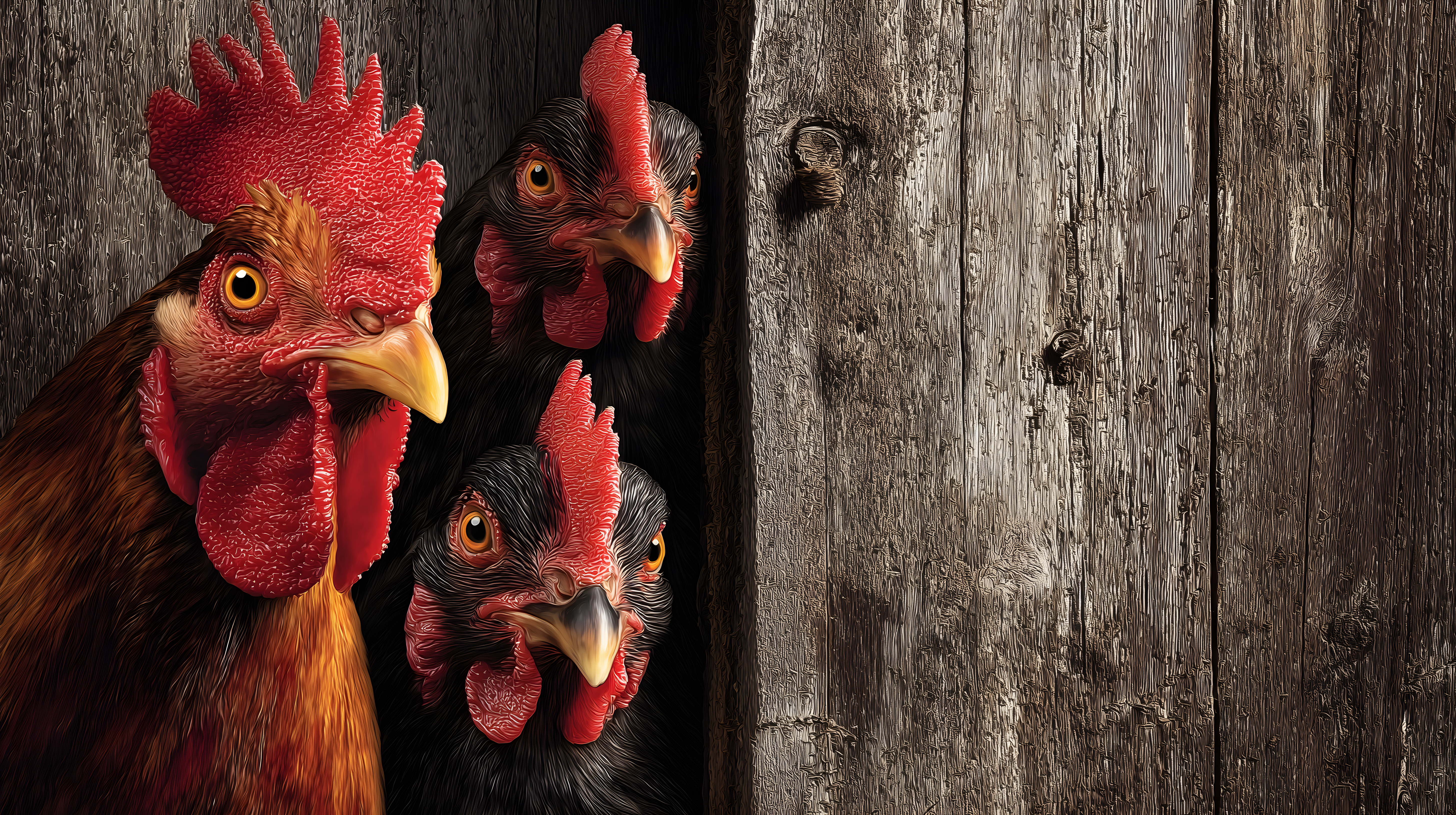 Dieses Bild zeigt drei neugierige Hühner, die aus einer alten, verwitterten Holzbox hervorlugen. Die kräftig roten Kämme und leuchtenden Augen der Tiere verleihen dem Bild eine lebendige und faszinierende Atmosphäre. Die raue, ländliche Optik des Holzuntergrunds bildet einen stimmungsvollen Kontrast zu den prächtigen Federkleidern der Hühner. Dieses hochauflösende Stockfoto eignet sich hervorragend für den Einsatz in Blogs, Newslettern, Social-Media-Beiträgen oder Werbematerialien mit einem ländlichen, rustikalen Thema. Es steht unter einer Creative-Commons-Lizenz kostenlos zur Verfügung.
