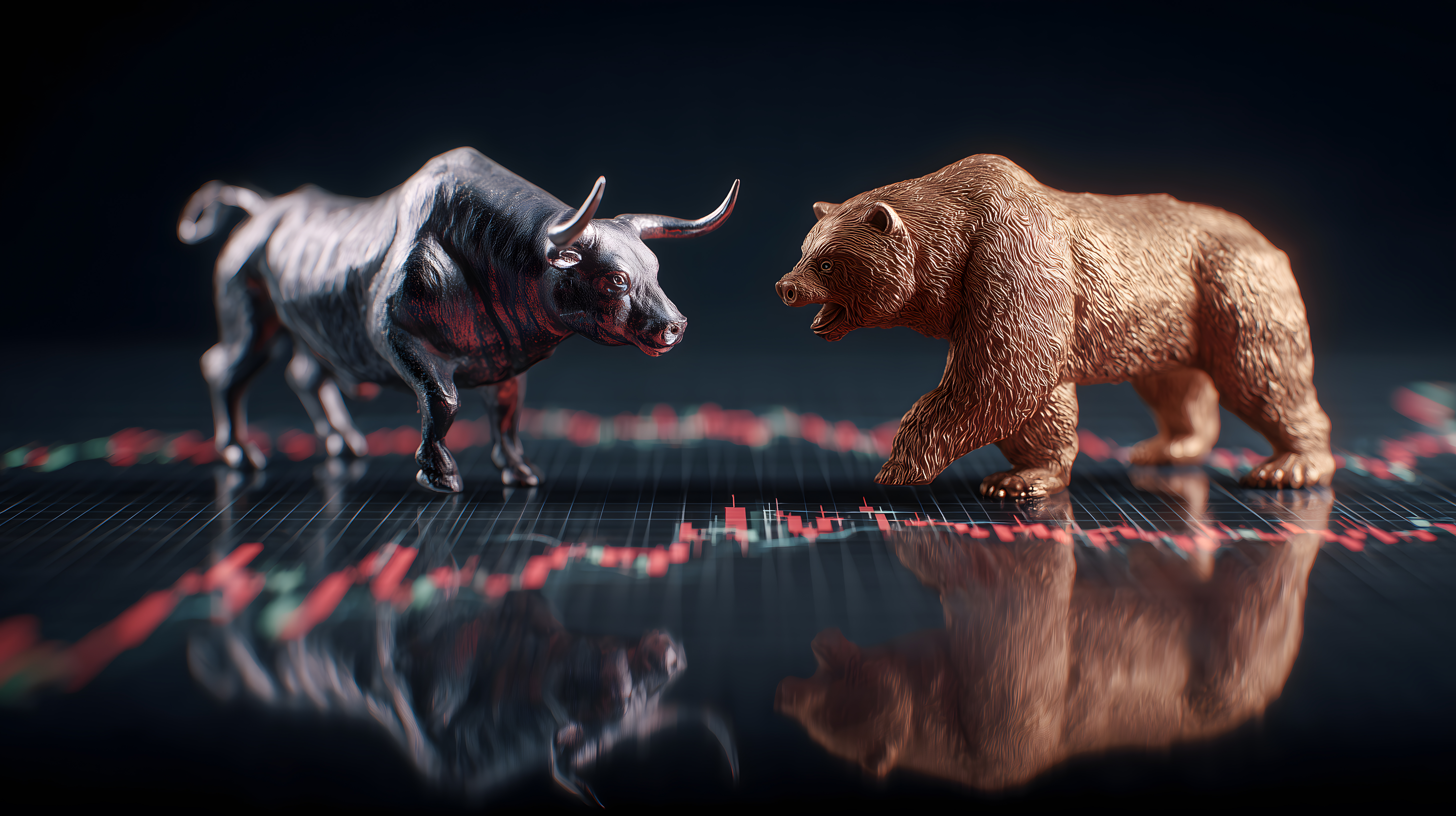 Dieses düstere Börsenfoto zeigt zwei Statuen - einen schwarzen Bullen und einen braunen Bären - die einander gegenüberstehen und sich offenbar in einem Machtkampf befinden. Der Hintergrund ist in dunklen, kontraststarken Farben gehalten und lässt eine angespannte Marktsituation erahnen. Die Reflexion der Figuren auf der glatten, roten Oberfläche verstärkt den Eindruck von Anspannung und Unsicherheit. Dieses eindrucksvolle Stockfoto eignet sich hervorragend für Wirtschaftsberichte, Finanzanalysen und Beiträge zu Börsentrends und Marktentwicklungen. In hoher Auflösung und mit einer Creative-Commons-Lizenz versehen, kann es kostenlos für vielfältige redaktionelle und kommerzielle Zwecke genutzt werden.