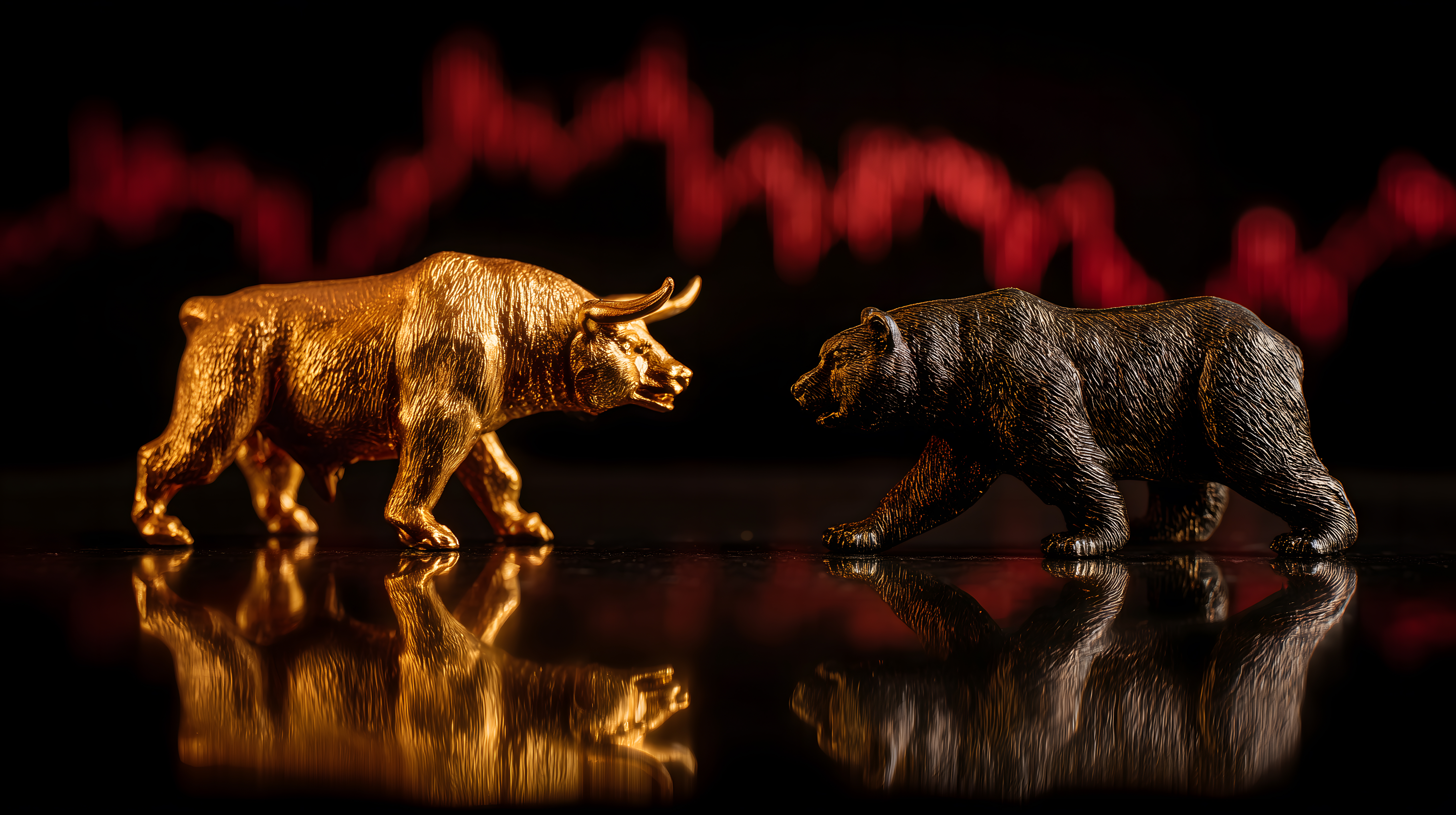 Dieses fesselnde Bild zeigt zwei Titantiere der Finanzmärkte - einen goldenen Bullen und einen schwarzen Bären - in einem dramatischen Wettstreit. Die imposanten Tiere stehen sich spiegelbildlich gegenüber, ihre Reflexionen in einer glatten, dunklen Oberfläche wie Kontrahenten in einer Börsenschlacht. Der feurige rote Hintergrund verstärkt die Spannung des Moments und vermittelt eine Atmosphäre von Entschlossenheit und Wettbewerbsgeist. Dieses Stockfoto in hoher Auflösung eignet sich hervorragend für Blog-Beiträge, Newsletter-Gestaltung oder Social-Media-Werbung rund um Finanzthemen.