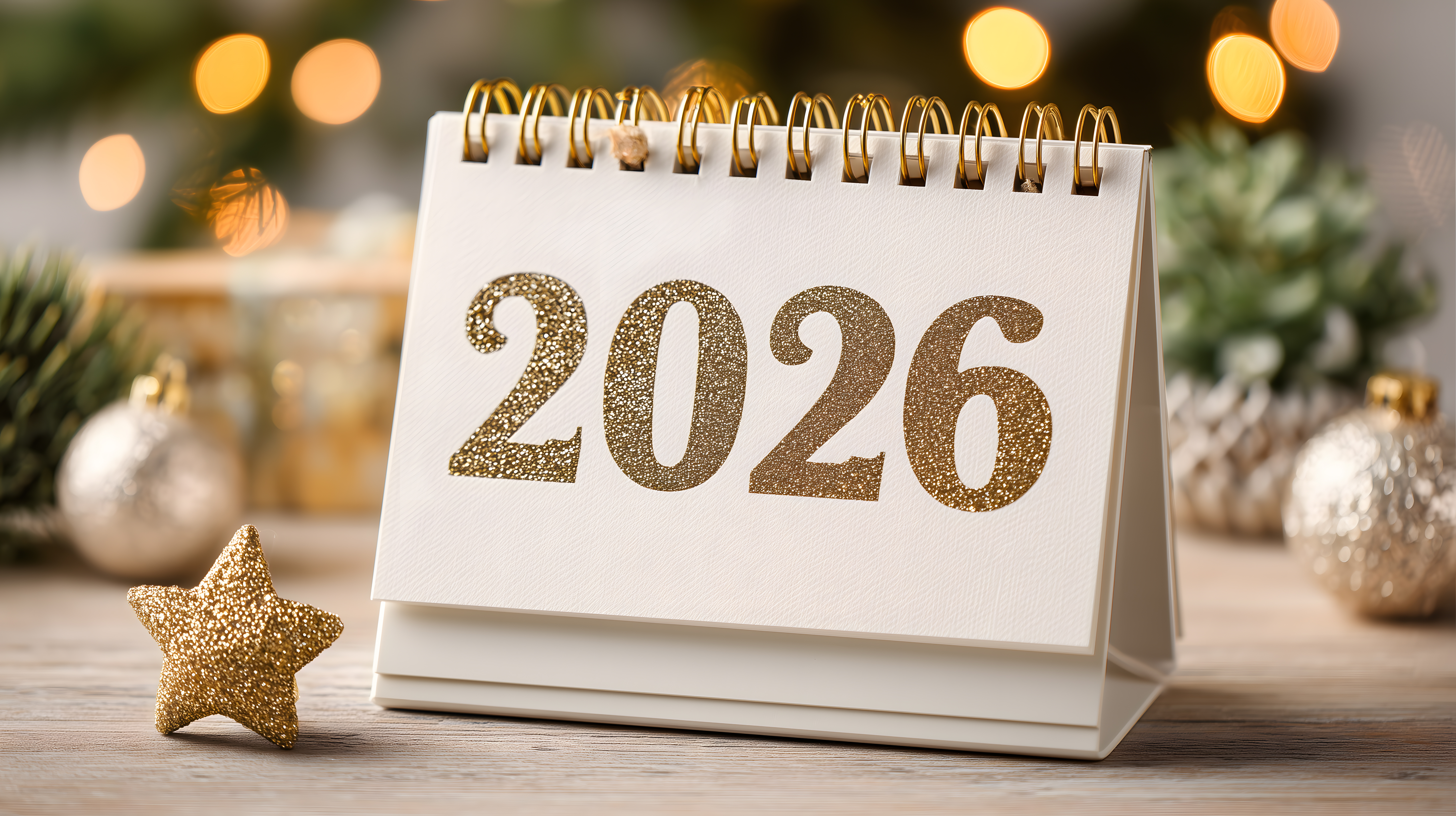 Dieses festliche Stockfoto zeigt einen Kalender für das Jahr 2026 mit goldfarbenen, glitzernden Zahlen. Der Kalender steht auf einem Holztisch, umgeben von weihnachtlichen Dekorationen wie einem goldenen Stern und verschwommenen Lichterketten im Hintergrund. Das Bild strahlt Eleganz und Feiertagsstimmung aus und eignet sich hervorragend für die Gestaltung von Blogbeiträgen, Newslettern, Werbematerialien und Social-Media-Posts rund um Neujahr, Weihnachten und Jahresplanung. Das hochauflösende Foto ist kostenfrei als Creative-Commons-Lizenz nutzbar.