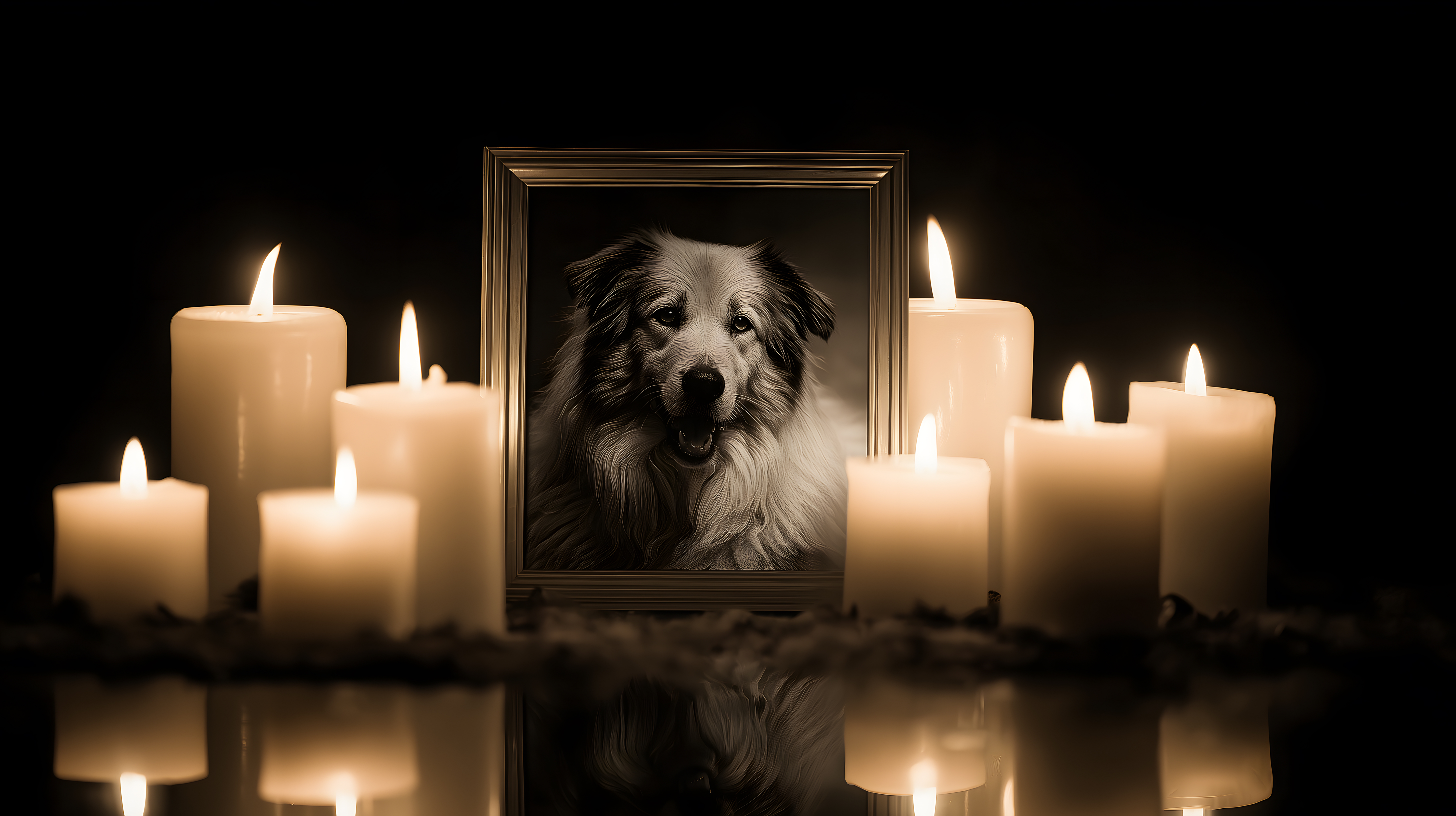 Dieses ergreifende Foto zeigt den Portrait-Blick eines Hundes, eingerahmt in einem edel wirkenden Holzrahmen und umgeben von einer Vielzahl brennender Kerzen. Die Szene ist in einem dunklen, atmosphärischen Schwarz-Weiß-Stil gehalten, was eine ruhige, nachdenkliche Stimmung vermittelt. Der Hund blickt den Betrachter ernst, fast schon melancholisch an, als würde er an einen lieben Verstorbenen erinnern.