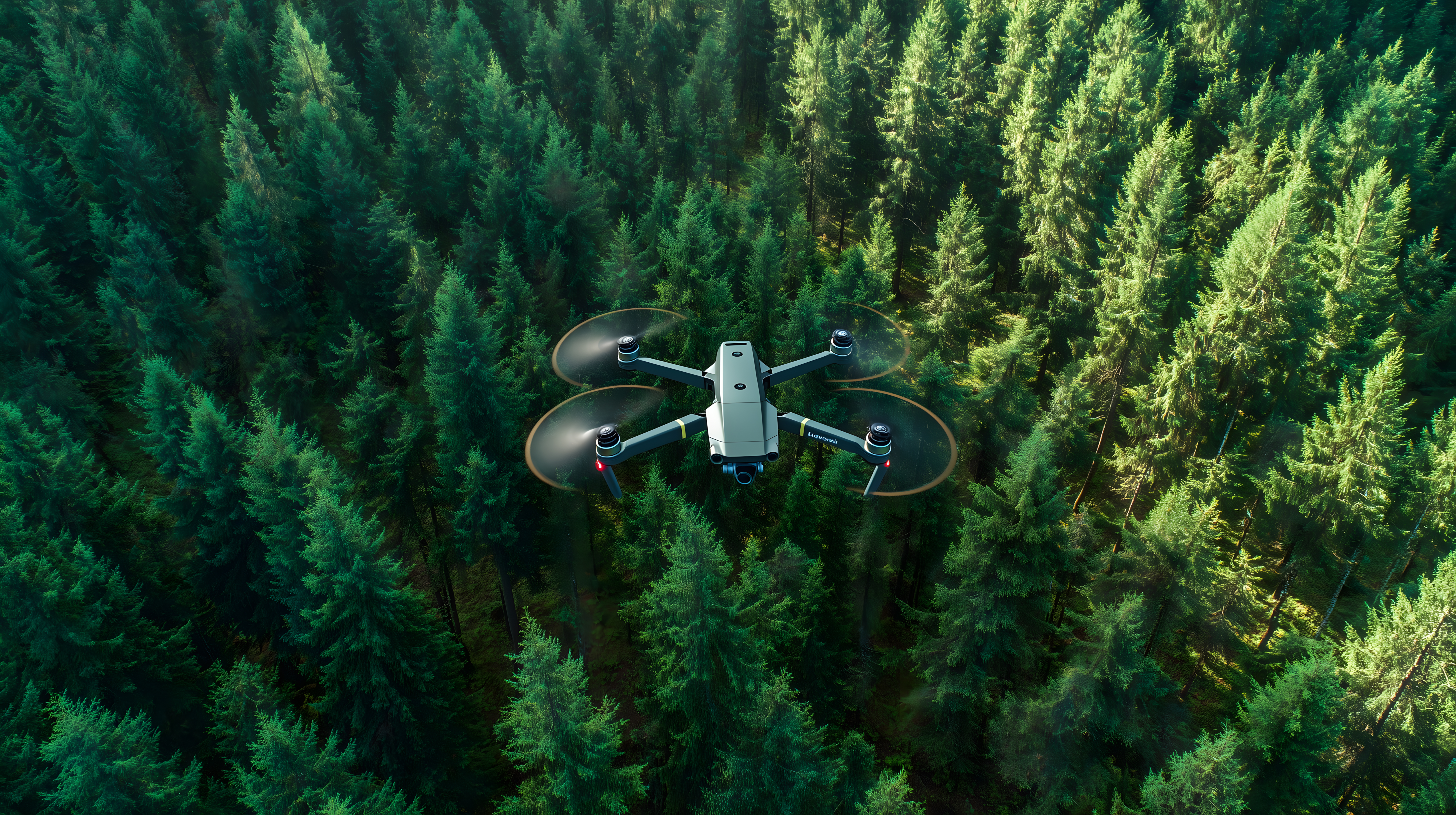 Das Bild zeigt eine Drohne, die über einem dichten, grünen Nadelwald schwebt. Die Drohne ist aus einer hohen Perspektive aufgenommen, sodass man den gesamten Wald überblicken kann. Das Bild vermittelt ein Gefühl von Freiheit und Bewegung, da die Drohne durch die Luft fliegt und einen einzigartigen Blick auf die Landschaft bietet. Die Farbpalette ist geprägt von verschiedenen Grüntönen, die den Wald lebendig und natürlich erscheinen lassen. Dieses hochauflösende Stockfoto eignet sich hervorragend für Blogs, Newsletter, Social-Media-Beiträge oder Werbematerialien, die ein Gefühl von Naturverbundenheit, Technik und Erkundung vermitteln möchten. Es steht unter einer Creative-Commons-Lizenz zur freien Nutzung zur Verfügung.