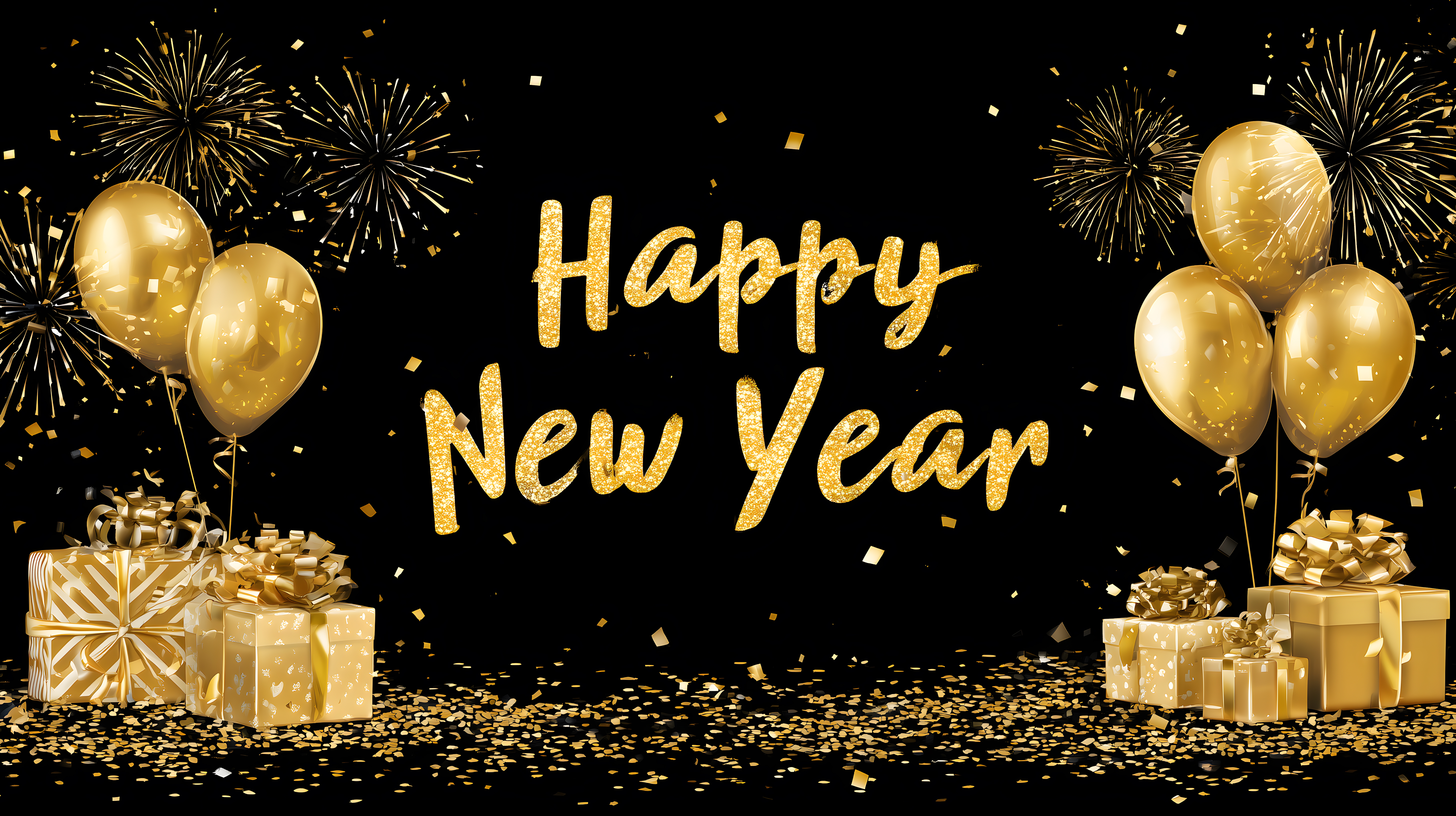 Dieses festliche Silvester-Bild zeigt eine farbenfrohe Szenerie mit goldenen Luftballons, Geschenken und funkelndem Konfetti vor einem schwarzen Hintergrund. Die elegante Komposition mit der goldenen Beschriftung 'Happy New Year' vermittelt eine feierliche und ausgelassene Stimmung. Dieses hochauflösende Stockfoto eignet sich hervorragend für die Verwendung in Blogs, Newslettern, Social-Media-Beiträgen oder Werbematerialien zum Jahreswechsel. Als kostenloses Creative-Commons-Foto kann es lizenzfrei genutzt werden.