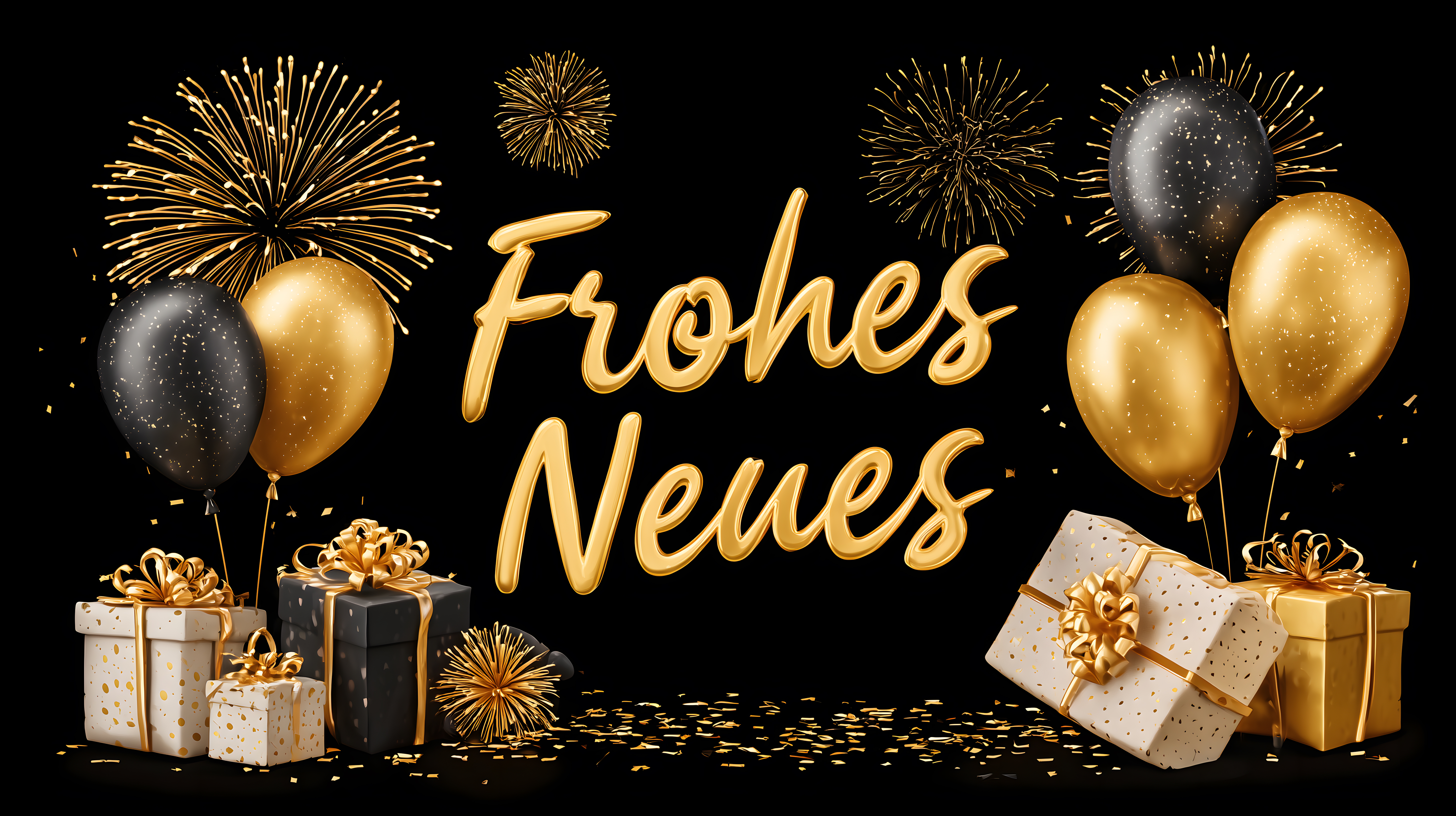 Dieses prächtige Bild zeigt eine stimmungsvolle Szenerie zum Jahreswechsel. Vor einem dunklen Hintergrund sind goldfarbene und schwarze Luftballons, funkelnde Feuerwerkskörper sowie elegant verpackte Geschenke mit Schleifen und Bögen zu sehen. Die Komposition ist sehr harmonisch und strahlt Feierlichkeit sowie Vorfreude auf das neue Jahr aus. Das Foto eignet sich hervorragend für den Einsatz in Werbematerialien, Blogbeiträgen, Social-Media-Kampagnen oder Newslettern rund um das Thema Neujahr und Jahreszeit. Dieses hochauflösende, kostenlose Stockfoto steht unter einer Creative-Commons-Lizenz zur Verfügung.