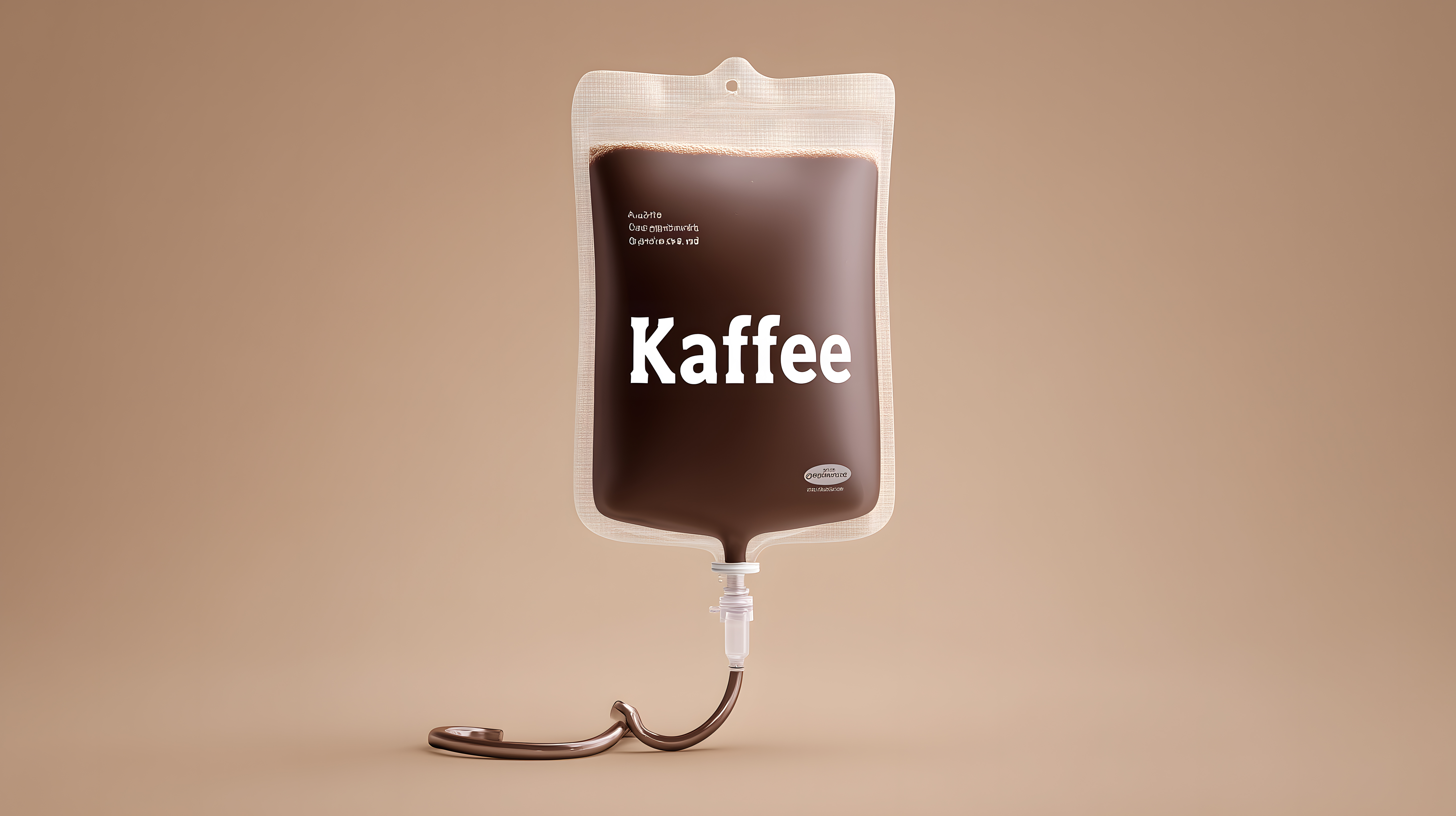 Das Bild zeigt einen Kaffee-Infusions-Beutel vor einem einfarbigen, beigen Hintergrund. Der Beutel ist in einem klaren, minimalistischen Design gehalten und trägt in großer, weißer Schrift das Wort "Kaffee". Der Beutel ist mit einer Aufhängeöffnung versehen, was ihn als Symbol für Energie, Koffeinversorgung und das Überwinden von Müdigkeit kennzeichnet.
