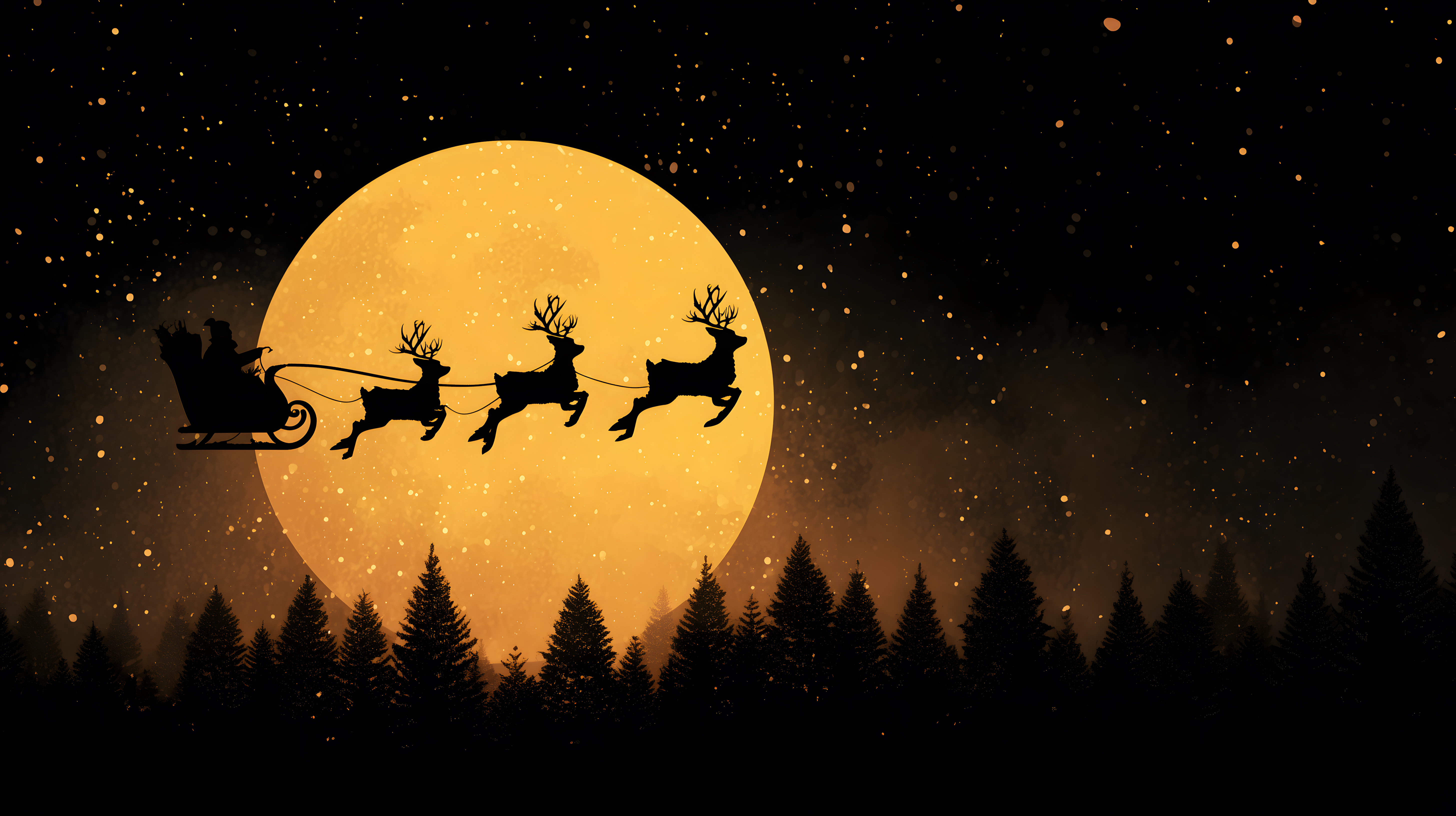Dieses Stockfoto zeigt die Silhouette des Weihnachtsmanns, der mit seinem Rentierschlitten vor einem riesigen, goldenen Vollmond über einem verschneiten Wald fliegt. Die Szene ist in dunklen, warmen Farben gehalten, was eine geheimnisvolle, märchenhafte Stimmung erzeugt. Das Bild könnte perfekt für Weihnachtskarten, Werbung, Blogs oder Social-Media-Postings rund um die Feiertage verwendet werden. Als kostenloses, hochauflösendes Stockfoto unter Creative-Commons-Lizenz ist es für verschiedenste Zwecke frei nutzbar.