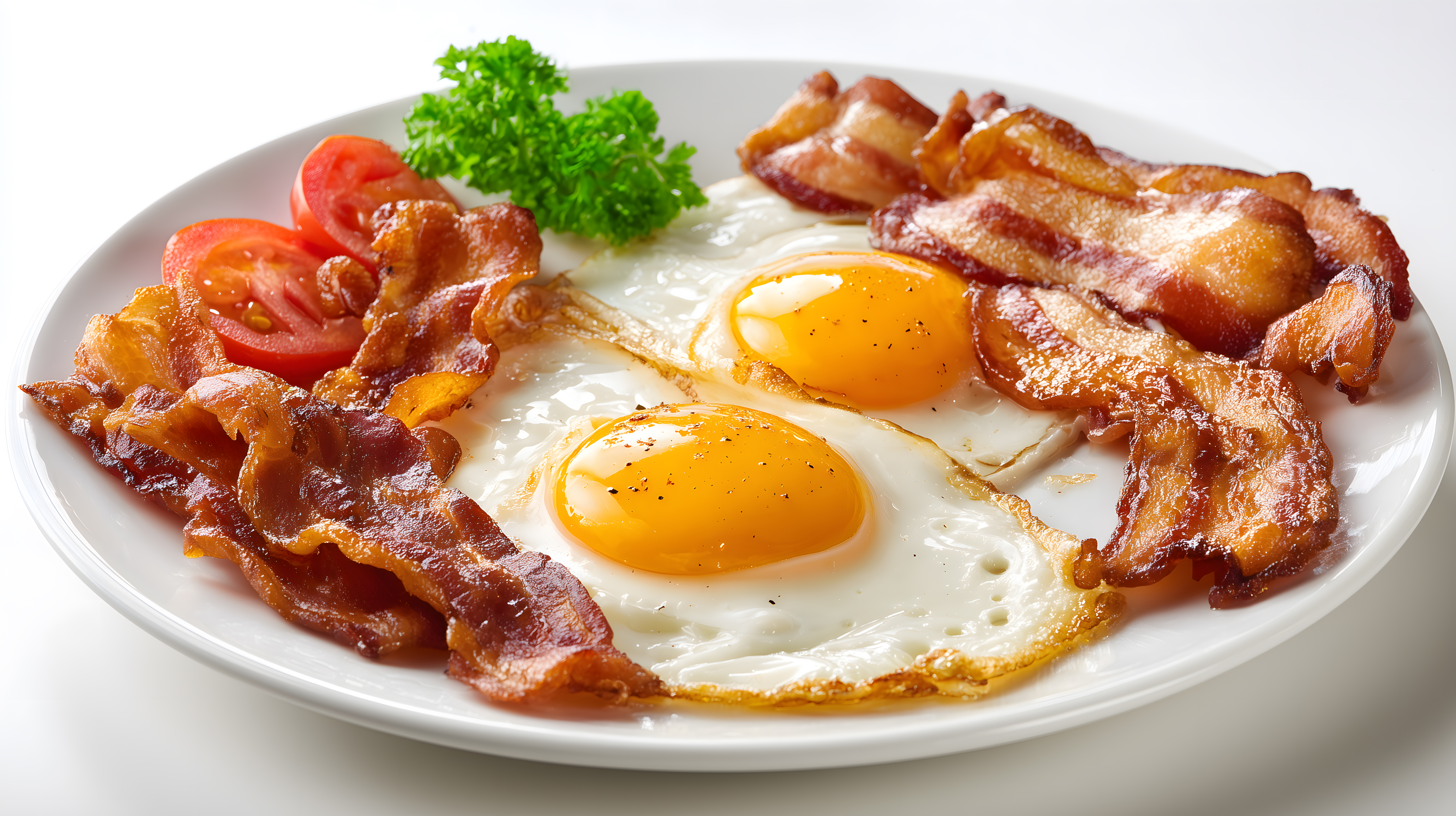 Dieses appetitliche Foto zeigt ein köstliches Frühstück mit knusprigem Speck, Spiegeleiern und frischen Tomaten auf einem weißen Teller. Die Anordnung der Zutaten ist stilvoll und lädt förmlich zum Genießen ein. Das Bild strahlt eine rustikale und natürliche Atmosphäre aus, die perfekt zu einem modernen, gesundheitsbewussten Lebensstil passt. Dieses hochauflösende Stockfoto eignet sich hervorragend für die Verwendung in Blogs, Newslettern, Social-Media-Postings oder Werbekampagnen rund um Themen wie Frühstück, gesunde Ernährung und Kulinarik. Es steht unter einer Creative-Commons-Lizenz zur freien Nutzung zur Verfügung.