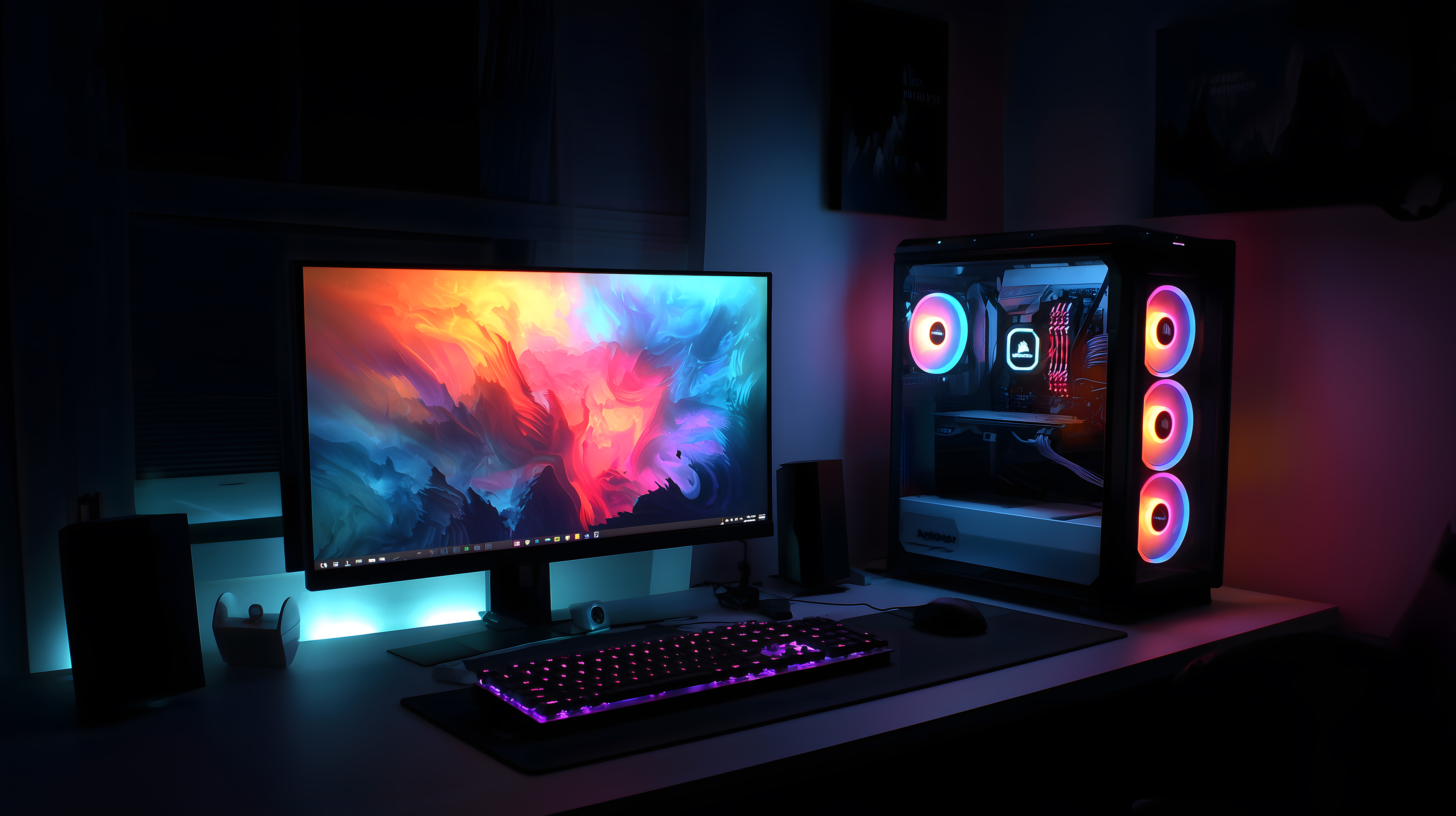 Das Bild zeigt einen aufwendig gestalteten Gaming-Arbeitsplatz in einem dunklen Raum. Im Vordergrund steht ein hochwertiger PC-Spielerechner mit RGB-Beleuchtung und auffallenden Lüftern. Daneben befindet sich eine Tastatur mit bunter Hintergrundbeleuchtung sowie eine Computermaus. Der Arbeitsplatz wird von zwei großen Monitoren dominiert, die ein stimmungsvolles, farbintensives Bild mit abstrakten Formen anzeigen. Die Beleuchtung des gesamten Setups sorgt für eine futuristische, atmosphärische Stimmung im ansonsten dunklen Raum.