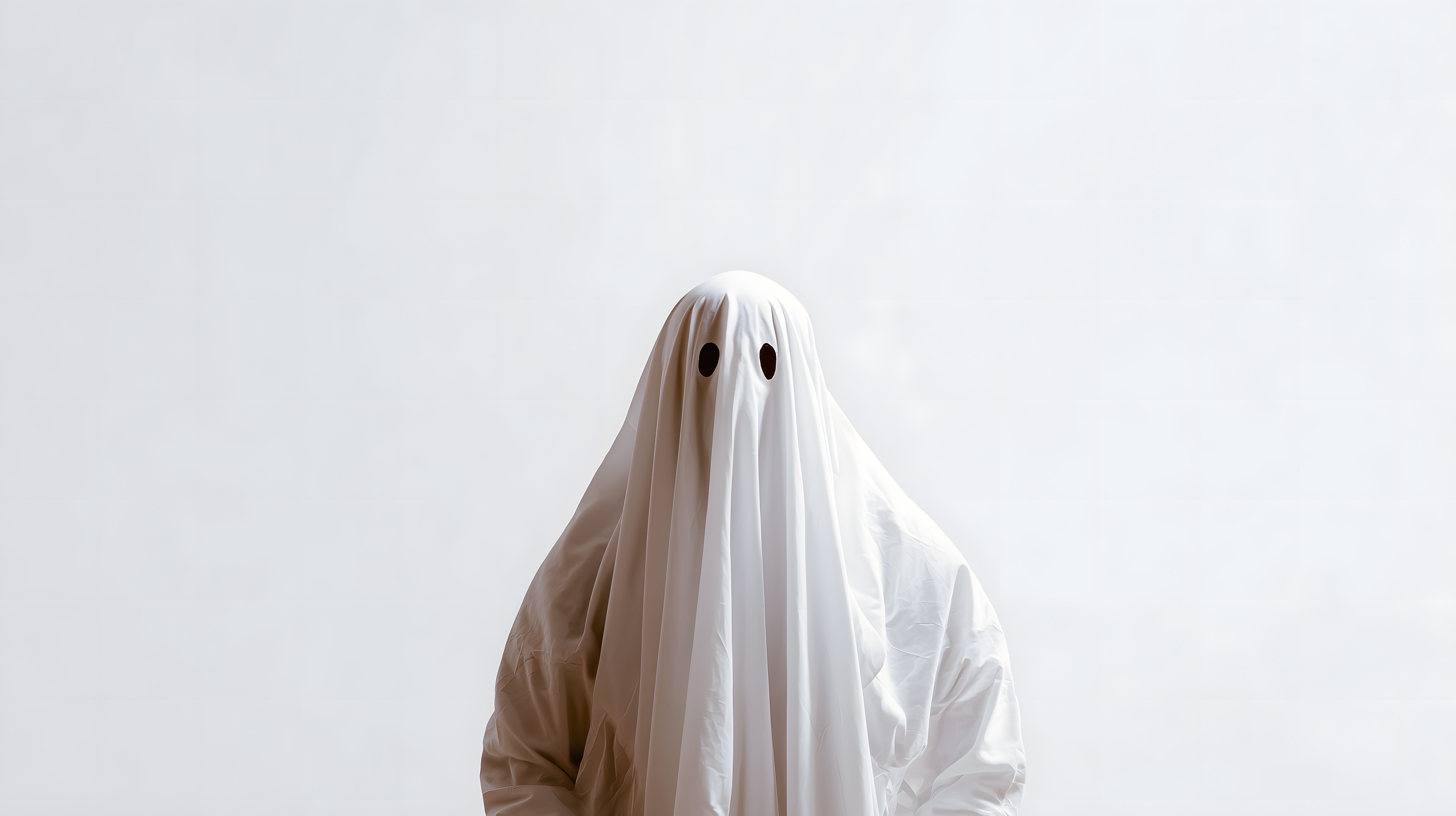 Dieses Foto zeigt ein minimalistisches Geisterkostüm vor weißem Hintergrund. Das weiße Laken ist so arrangiert, dass es einen geisterhaften Eindruck erweckt, mit zwei schwarzen Punkten als Augen. Das Bild besticht durch seine reduzierte, stilvolle Ästhetik und lässt viel Raum für Interpretation. Es eignet sich hervorragend als Stockfoto für kreative Projekte wie Grußkarten, Social-Media-Posts oder Werbematerialien rund um das Thema Halloween. Das hochauflösende Foto steht unter einer Creative-Commons-Lizenz und kann kostenlos verwendet werden.