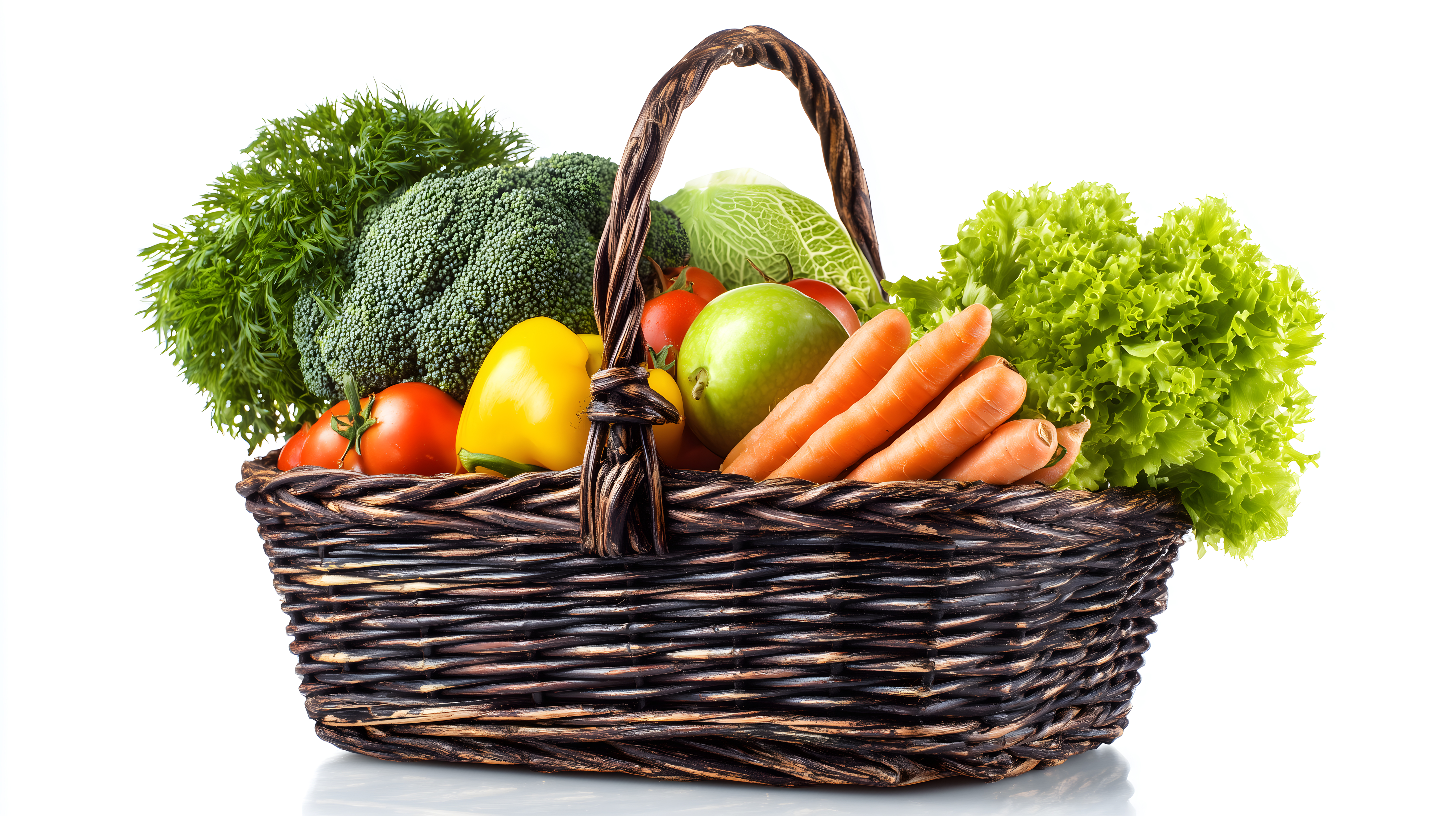 Dieses Foto zeigt einen reich beladenen Weidenkorb voller frischer, saisonaler Gemüseprodukte. Der Korb enthält eine Vielzahl an bunten Lebensmitteln wie Karotten, Brokkoli, Tomaten, Salat und Kräuter wie Petersilie. Die natürlichen Farben und Formen der Produkte ergeben eine harmonische, appetitanregende Komposition vor weißem Hintergrund. Dieses hochauflösende Stockfoto unter Creative-Commons-Lizenz eignet sich perfekt für den Einsatz in Blogs, Social-Media-Beiträgen, Newslettern oder Werbekampagnen rund um gesunde Ernährung, Veggie-Küche und natürliche Lebensmittel.
