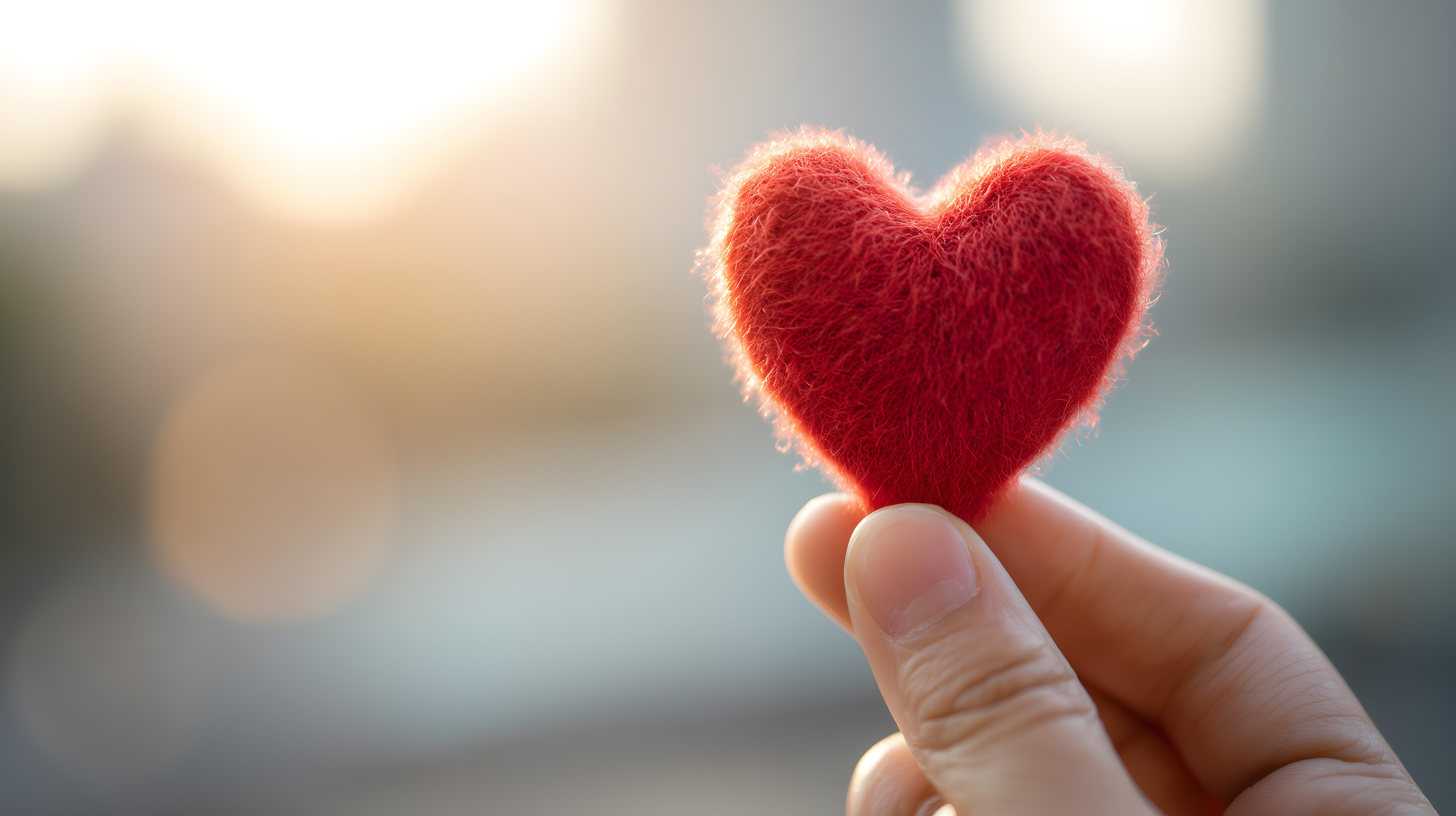 Das Foto zeigt eine nahaufnahme einer Hand, die ein weiches, rotes Herz hält. Das Herz ist aus Plüsch oder ähnlichem Material und scheint im warmen Sonnenlicht zu leuchten. Die Perspektive legt den Fokus auf die zärtliche Geste und das Herzstück, das als Symbol der Liebe, Fürsorge und Emotion fungiert. Dieses hochwertige Stockfoto eignet sich hervorragend für den Einsatz in Blogs, Newslettern, Werbematerialien und sozialen Medien rund um die Themen Beziehung, Heilung und Inspiration. Es ist in hoher Auflösung und unter einer Creative-Commons-Lizenz verfügbar.