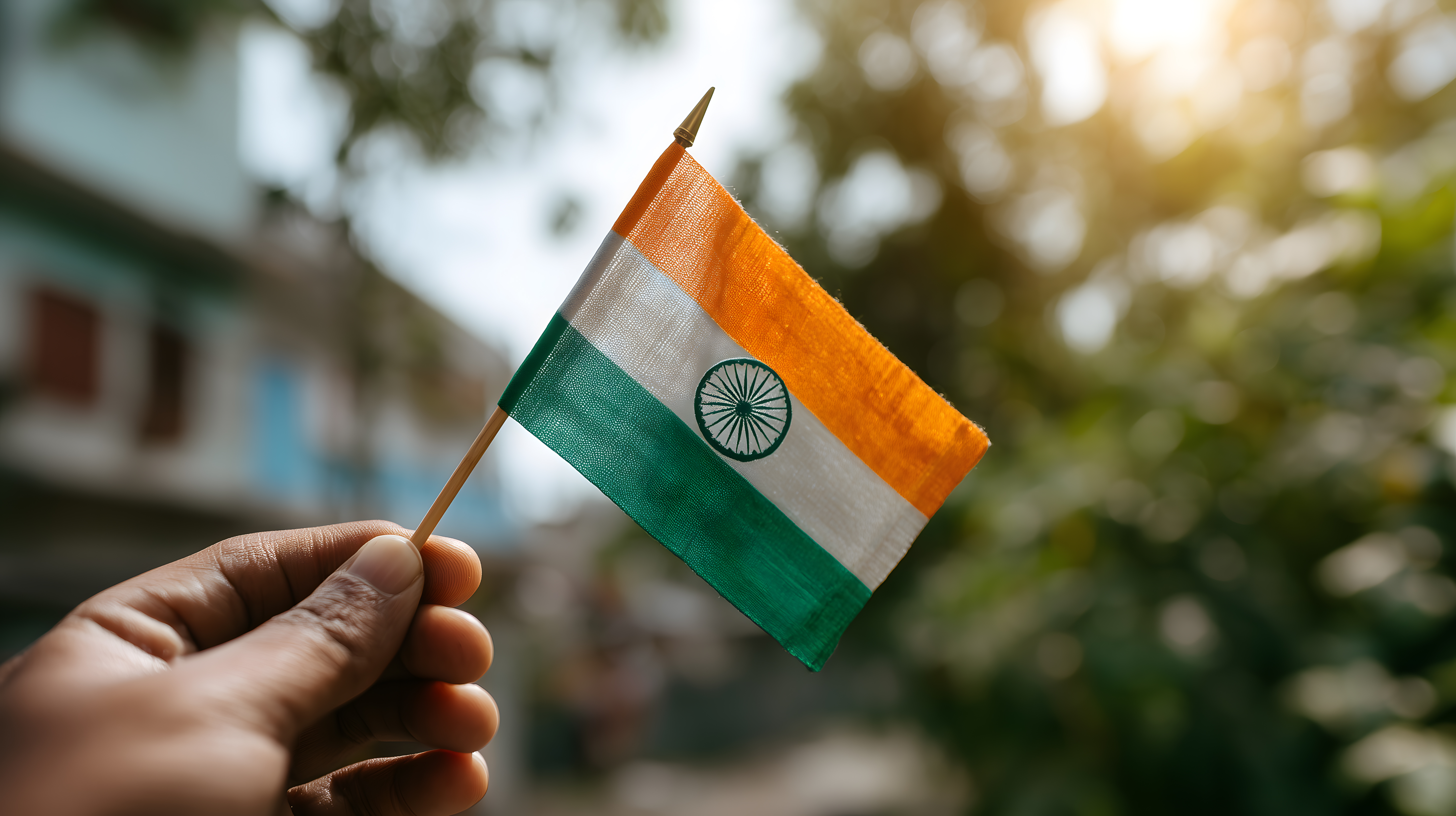 Dieses Foto zeigt eine Hand, die eine bunte indische Flagge hoch hält. Die Flagge weht im Sonnenlicht, was eine lebendige und bewegte Szene erzeugt. Die orangefarbenen, weißen und grünen Streifen der Flagge kontrastieren schön mit dem unscharfen, grünen Hintergrund, der einen natürlichen Rahmen bildet. Das Foto vermittelt ein Gefühl von Patriotismus, Stolz und Freiheit. Es eignet sich hervorragend für den Einsatz in Blogs, Newslettern, Social-Media-Kanälen oder Werbematerialien, die einen indischen oder allgemeinen patriotischen Kontext haben. Dieses kostenlose Stockfoto ist in hoher Auflösung und unter einer Creative-Commons-Lizenz verfügbar.