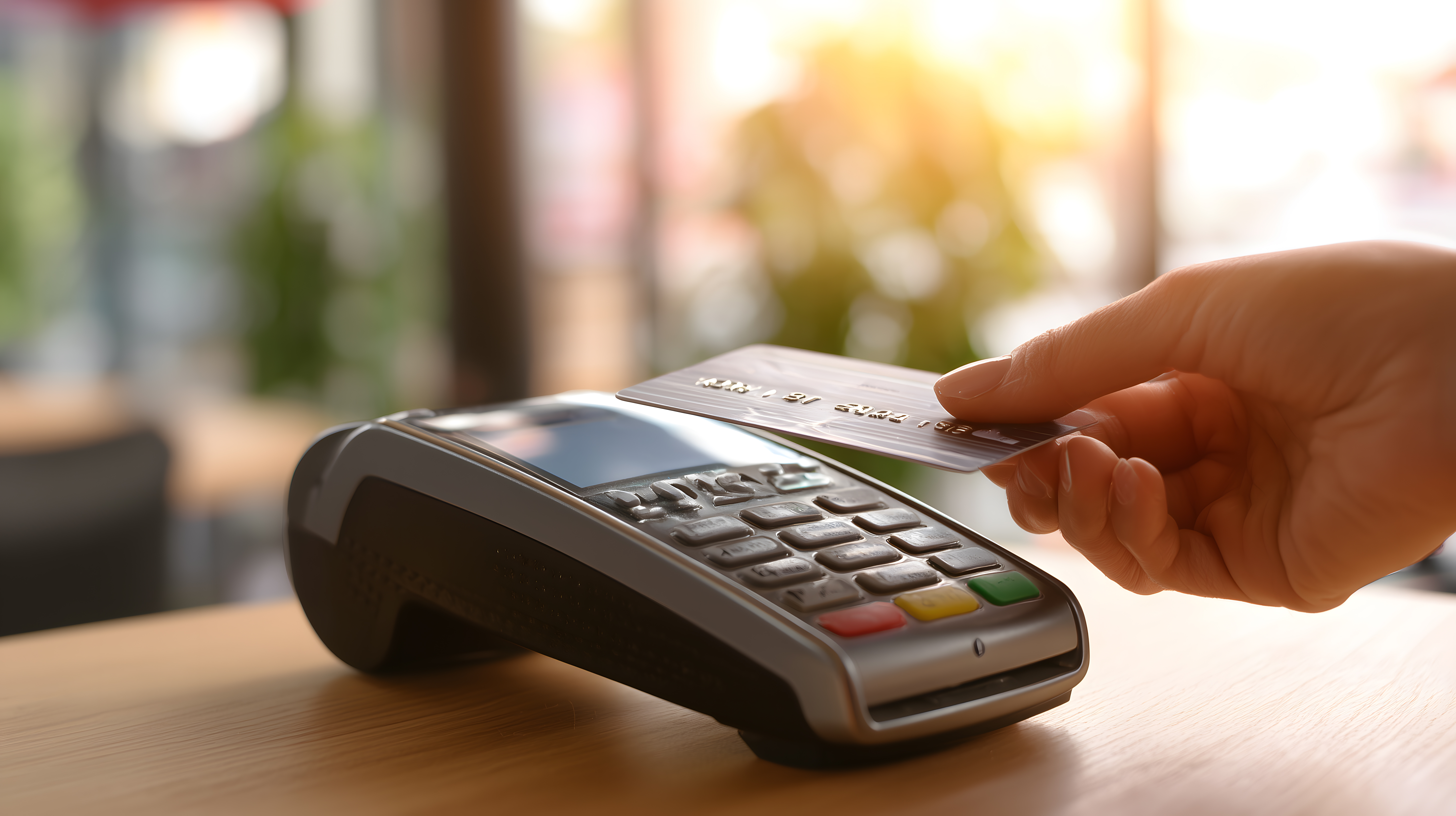 Das Foto zeigt eine Nahaufnahme einer Hand, die eine Kreditkarte an ein Bezahlterminal hält. Das Terminal ist schwarz mit Tasten und Anzeigen. Das Foto suggeriert die Handlung des kontaktlosen Bezahlens, bei der die Kreditkarte nicht in ein Lesegerät eingesteckt, sondern nur an das Terminal gehalten wird.