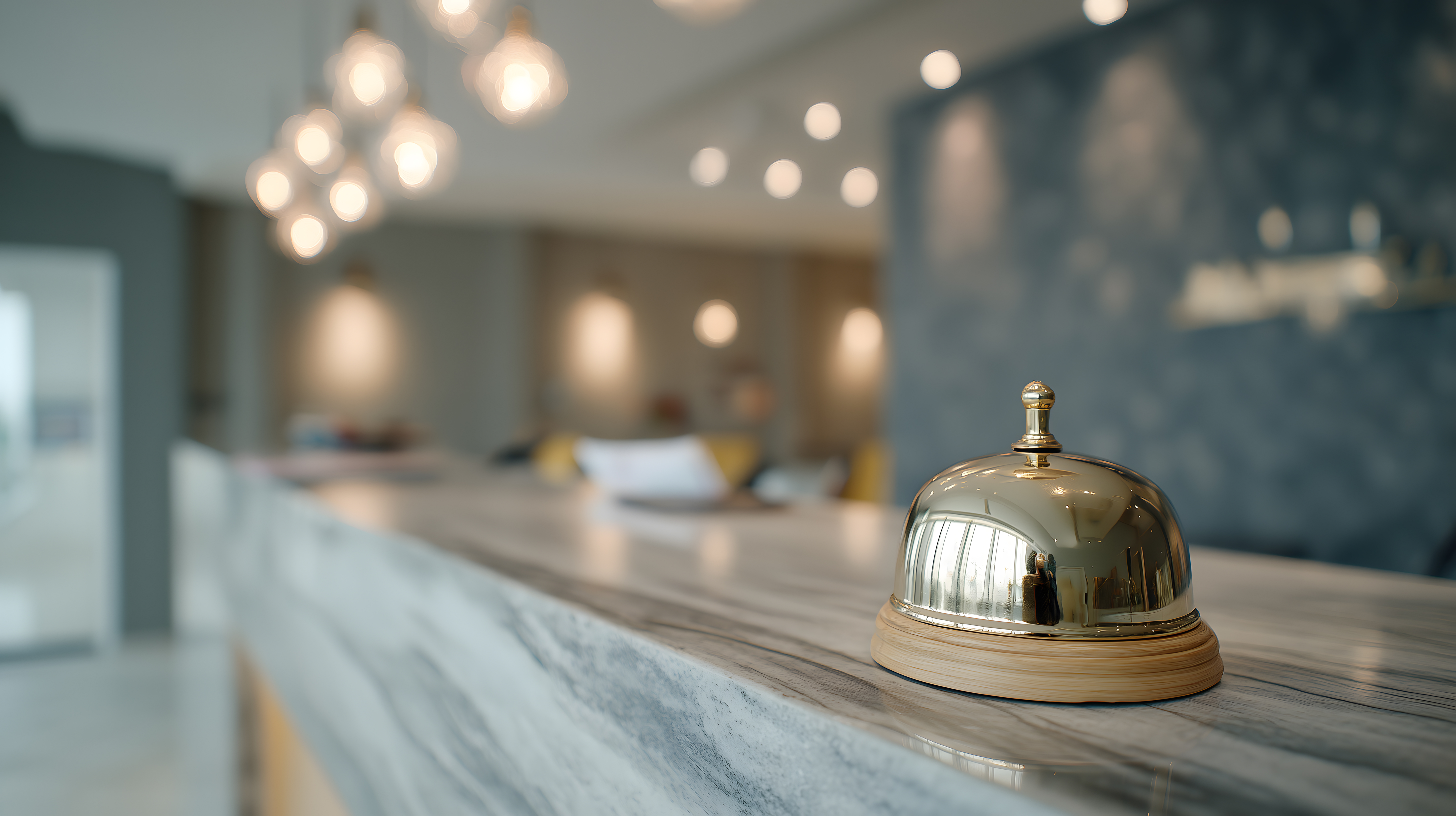 Dieses Foto zeigt eine einladende und luxuriöse Hotellobby mit einem beeindruckenden Marmortresen und einer glänzenden Empfangsschelle. Die Beleuchtung sorgt für eine warme und einladende Atmosphäre. Das Bild vermittelt Eleganz, Gastfreundschaft und einen hochwertigen Hotelstandard. Es eignet sich hervorragend als Stockfoto für Werbung, Websites, Magazine oder Social-Media-Beiträge im Bereich Gastgewerbe, Tourismus und Luxus. Das hochauflösende und frei nutzbare Foto ist unter Creative-Commons-Lizenz verfügbar.