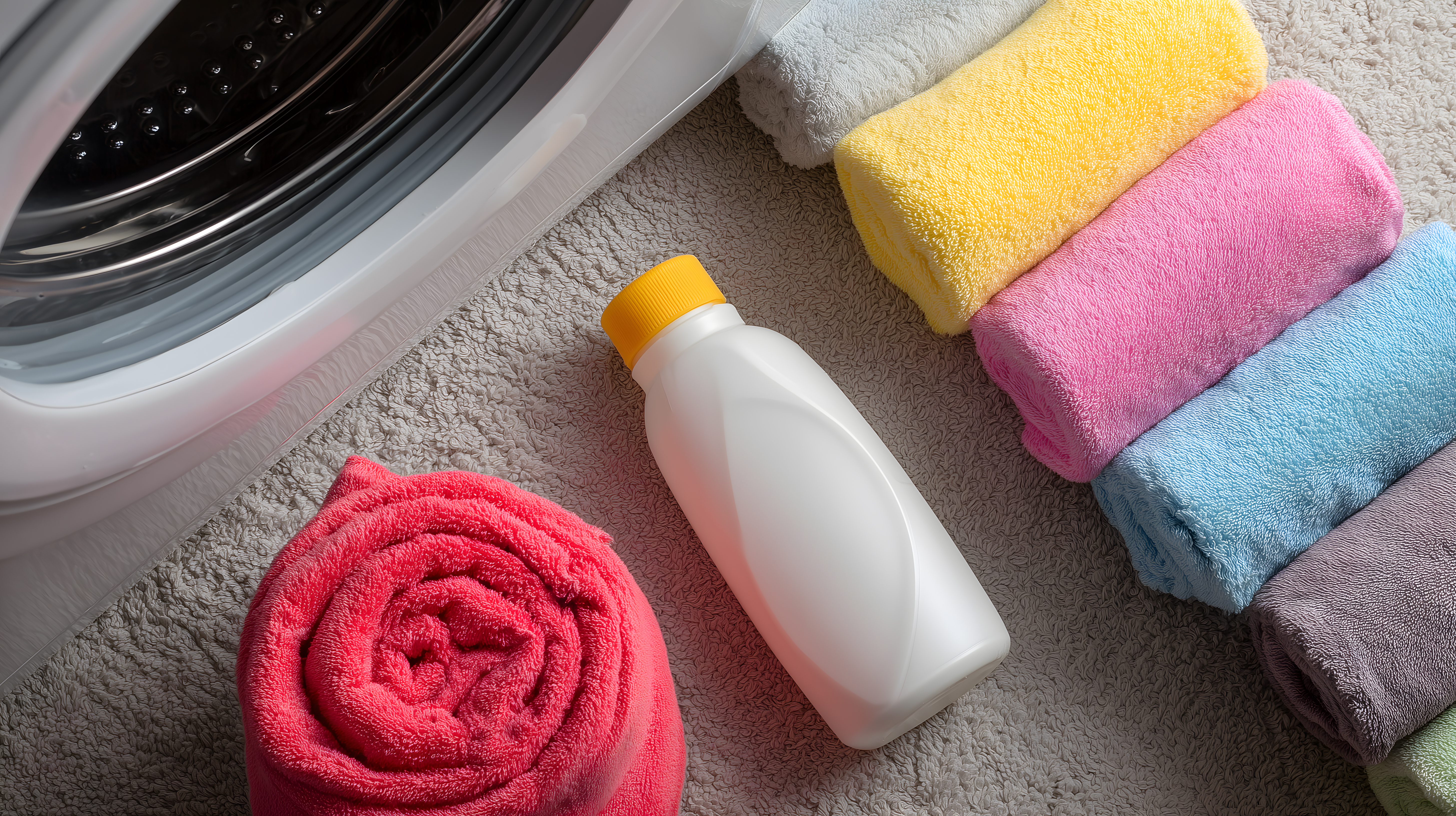 Das Foto zeigt eine Anordnung von frisch gewaschenen Handtüchern in verschiedenen Farben, wie Pink, Gelb und Blau, sowie einen Behälter mit Waschmittel neben einer Waschmaschine. Die Handtücher sind ordentlich aufgestapelt und die Waschmaschine ist im Hintergrund zu sehen. Das Bild vermittelt ein sauberes, aufgeräumtes und frisches Ambiente, das sich perfekt für den Einsatz in Blogs, Newslettern, Social-Media-Posts oder Werbematerialien zum Thema Haushaltsführung, Hygiene und Reinigung eignet. Als hochauflösendes Stockfoto unter Creative-Commons-Lizenz ist es kostenlos für private und kommerzielle Zwecke verwendbar.
