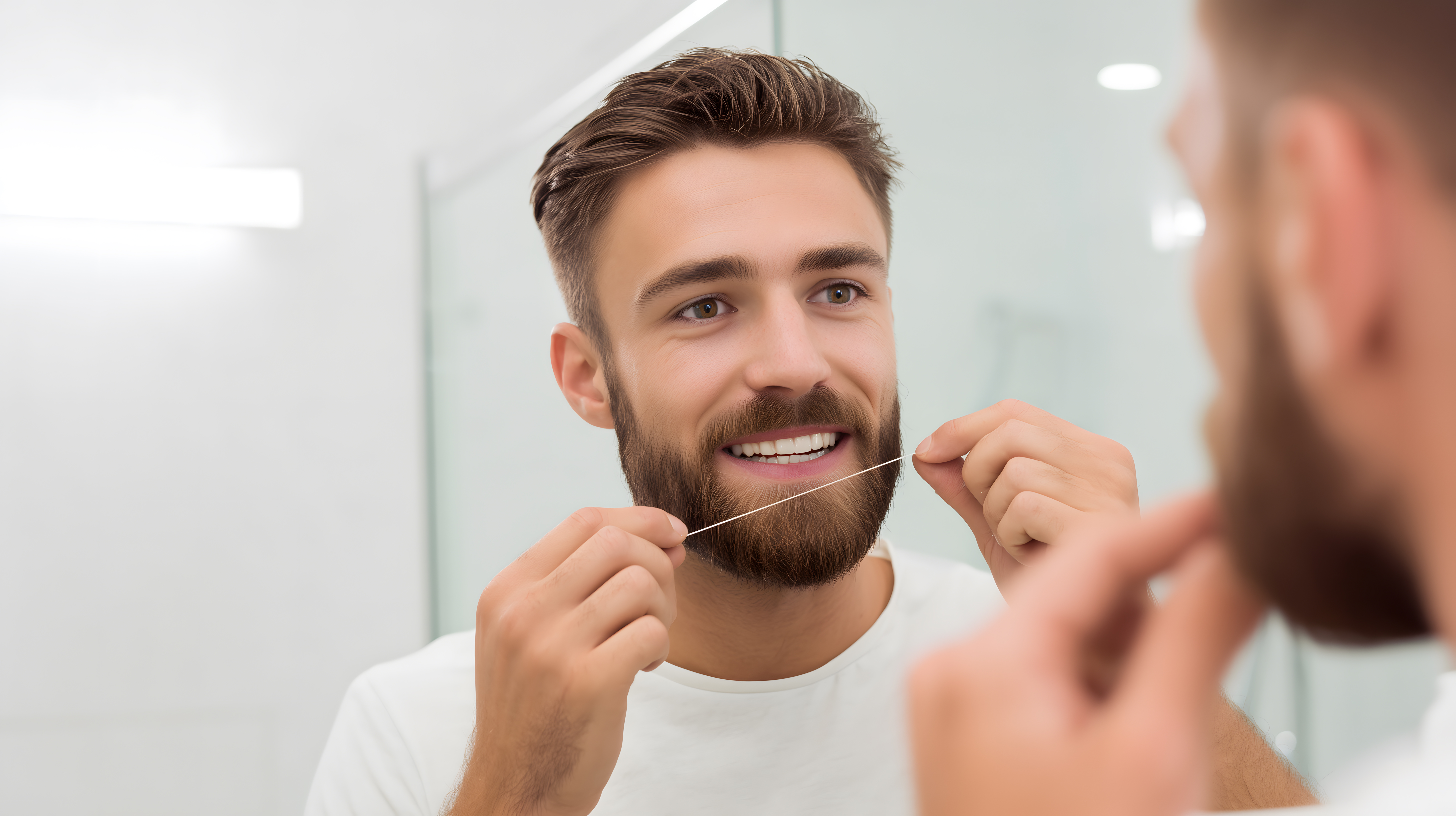 Das Bild zeigt einen jungen, gutaussehenden Mann, der vor einem Spiegel steht und mit Zahnseide seinen Bart pflegt. Er hat eine ansprechende Frisur und einen sorgfältig gepflegten Vollbart. Die Szene vermittelt ein Gefühl von Sauberkeit, Selbstfürsorge und modernem Lifestyle. Dieses hochwertige Foto eignet sich perfekt für den Einsatz in Blogbeiträgen, Newsletter-Designs, Social-Media-Posts oder Werbekampagnen rund um das Thema Grooming, Männerpflege oder Gesundheit und Wellness. Als kostenloses Stockfoto in hoher Auflösung und unter Creative-Commons-Lizenz frei nutzbar.