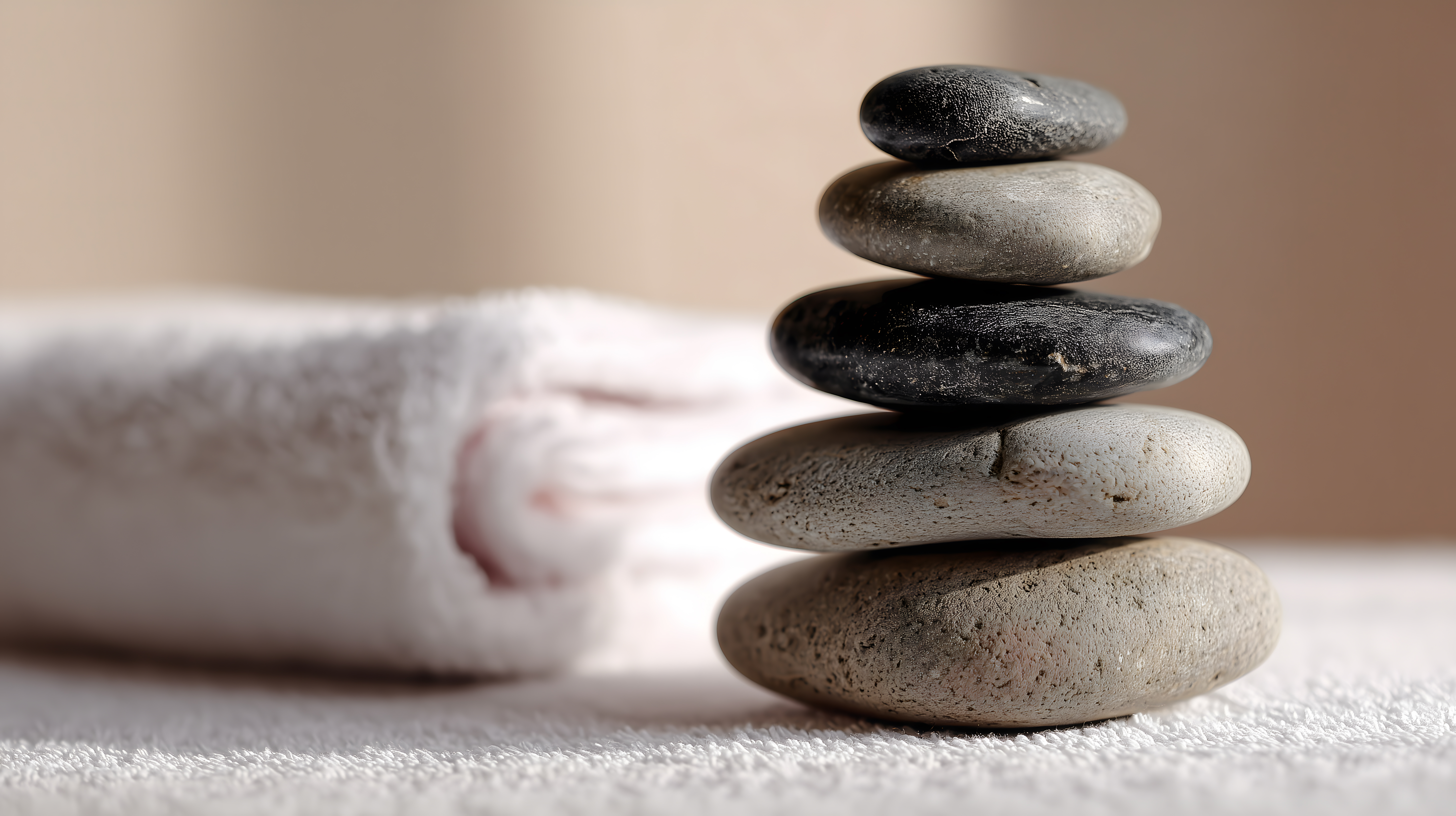 Gestapelte Wellness-Steine auf flauschigem Handtuch von Marco Verch unter Creative Commons 2.0
