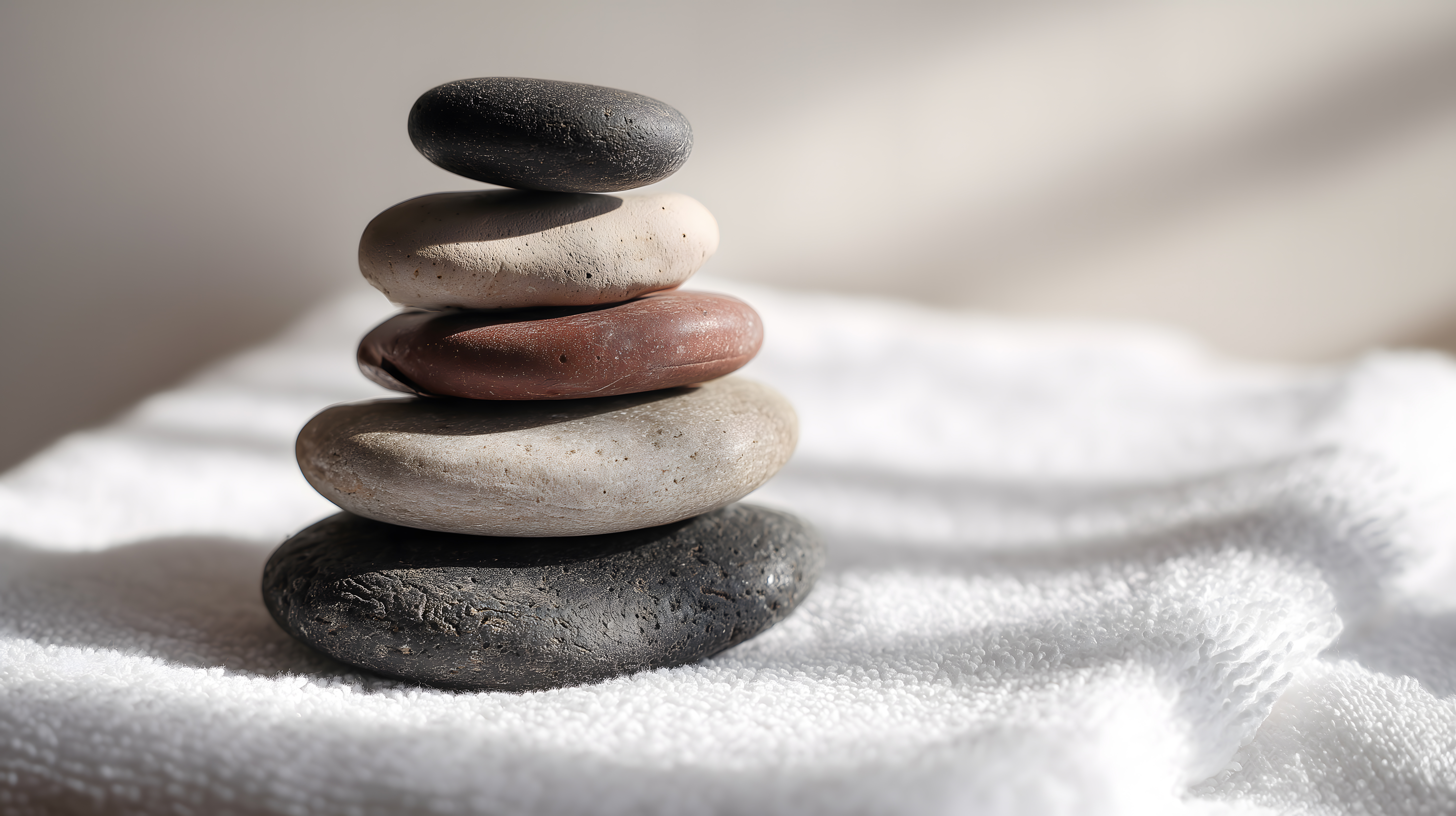 Das Foto zeigt einen Stapel von Steinen in verschiedenen Grautönen, Braun- und Schwarztönen, der auf einem weißen, flauschigen Handtuch platziert ist. Die Steine sind sorgfältig aufeinander gestapelt, wobei die oberen Steine etwas kleiner und heller sind als die unteren. Dieser minimalistisch-ästhetische Arrangement vermittelt einen Eindruck von Ruhe, Ausgeglichenheit und Meditation. Das Foto eignet sich hervorragend als kostenloses Stockfoto für Blogs, Newsletter, Social-Media-Beiträge oder Werbematerial rund um die Themen Entspannung, Wellness und Zen-Philosophie. Es ist in hoher Auflösung und unter der Creative-Commons-Lizenz verfügbar.