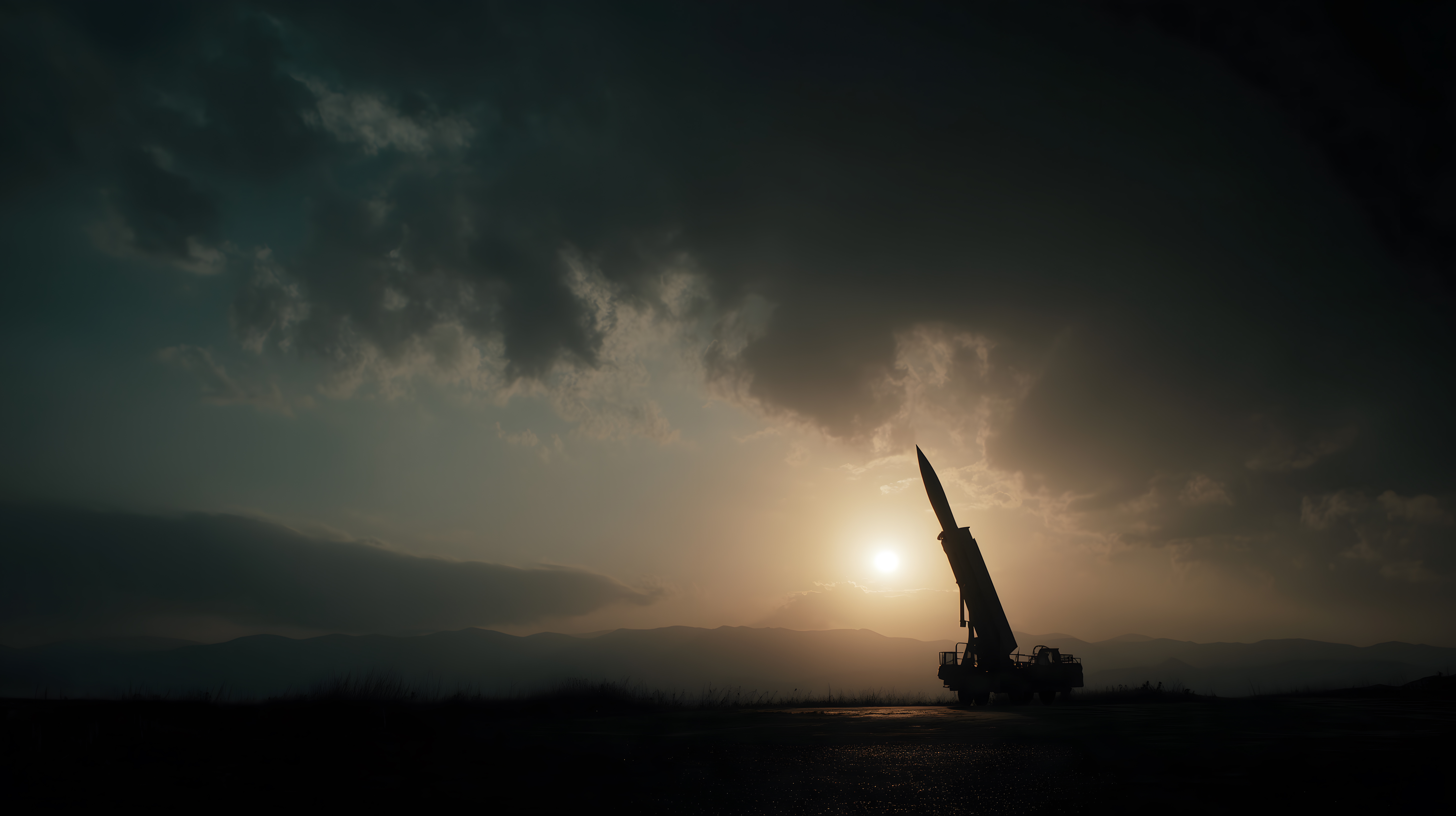 Das Bild zeigt die markante Silhouette einer Rakete, die vor einem dramatischen Himmel bei Sonnenuntergang steht. Die Rakete erhebt sich majestätisch in den Abendhimmel, umgeben von dunklen Wolken und einem warmen, orangefarbenen Licht am Horizont. Die Szene vermittelt eine Stimmung von Spannung, Technik und der Erkundung des Weltraums. Dieses hochauflösende Stockfoto in kreativer Lizenz eignet sich hervorragend für den Einsatz in Blogbeiträgen, Social-Media-Posts oder Werbematerialien, die ein futuristisches, technisches oder militärisches Thema behandeln.