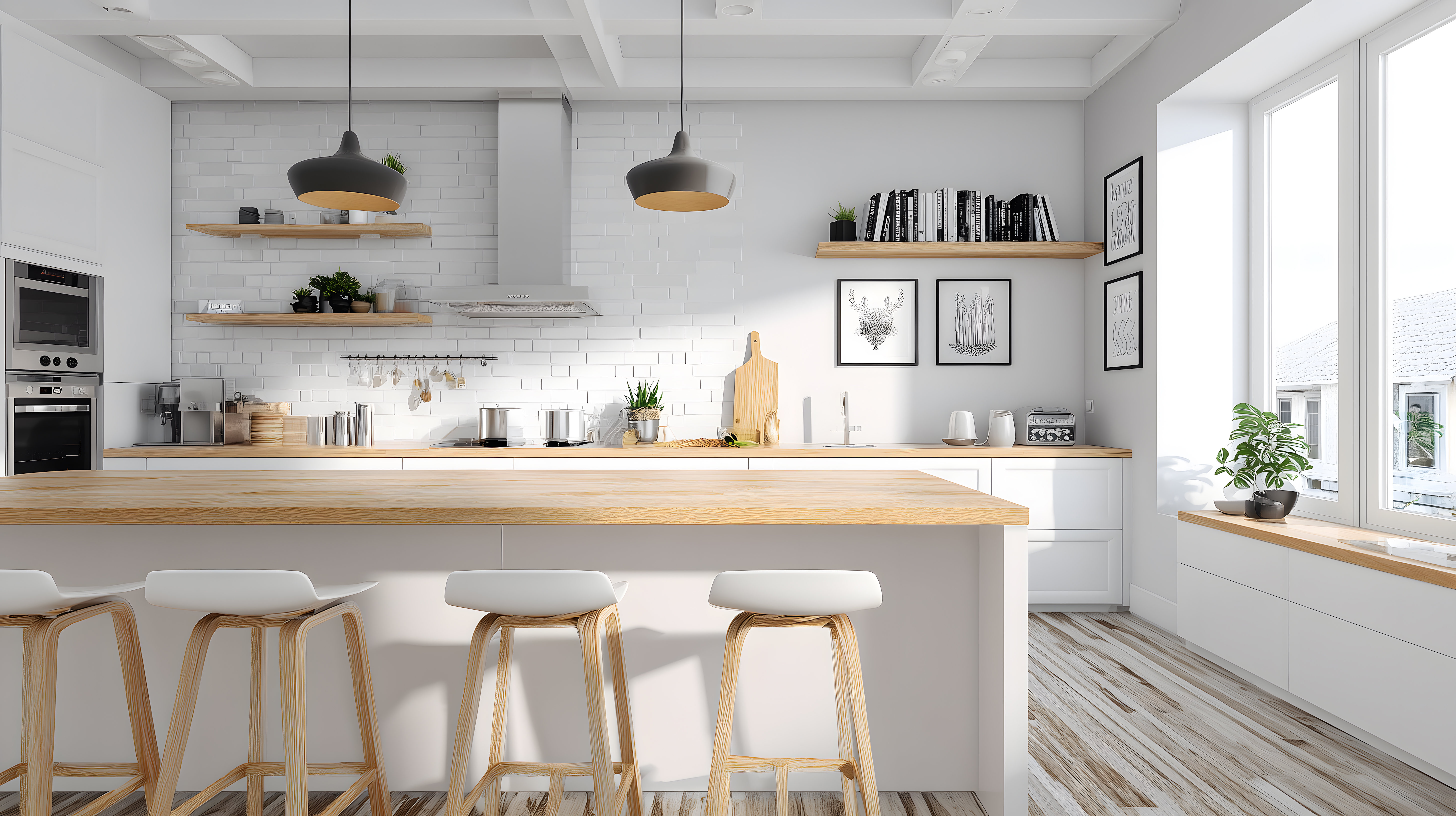 Dieses Foto zeigt eine helle, moderne Küche mit einer hochwertigen Holzarbeitsplatte. Der Raum ist großzügig geschnitten und bietet viel Platz zum Kochen und Verweilen. Die Küchenzeile ist weiß gehalten und wird durch offene Regale, Wandbilder und Pflanzen ergänzt, die dem Raum eine natürliche, gemütliche Atmosphäre verleihen. Zwei Pendelleuchten über der Arbeitsplatte sorgen für stimmungsvolles Licht. Das Foto eignet sich hervorragend als kostenloses Stockfoto für Blogs, Newsletter oder Social-Media-Beiträge rund um die Themen Kochen, Einrichten und Wohnen in modernem Ambiente. Die hohe Auflösung und Creative-Commons-Lizenz ermöglichen eine vielfältige Nutzung.