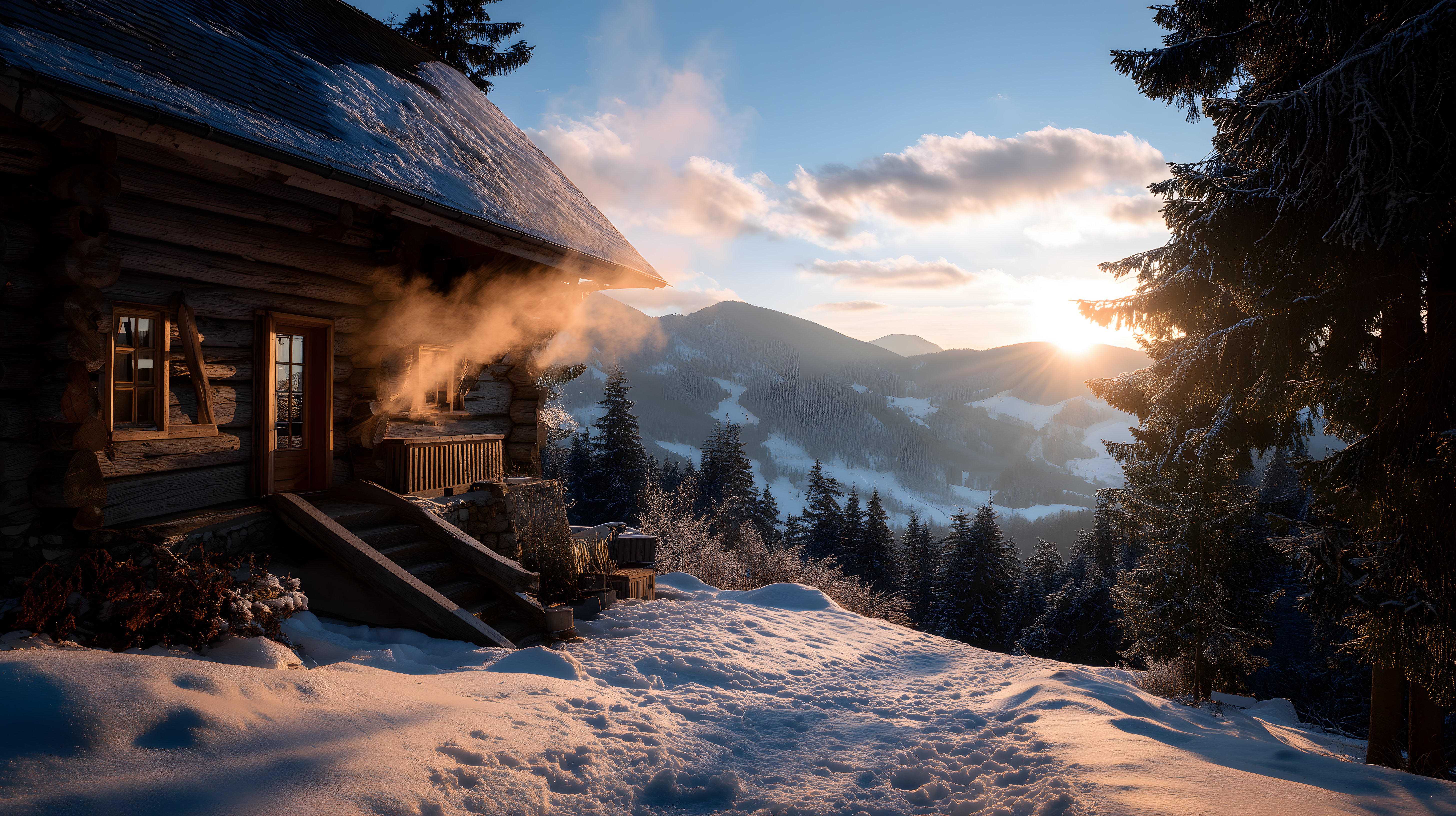Das Bild zeigt eine idyllische Almhütte, die am Fuße einer verschneiten Berglandschaft liegt. Die Hütte ist aus Holz gebaut und hat ein charakteristisches Satteldach. Aus dem Kamin steigt Rauch auf, der sich in der Kälte der Luft ausbreitet. Rund um die Hütte liegt dichter Schnee, der sich in der goldenen Abendsonne glitzert. Im Hintergrund ragen weitere bewaldete Berge auf, deren Konturen sich gegen den wolkenverhangenen Himmel abzeichnen. Eine wärmende, winterliche Stimmung breitet sich aus.