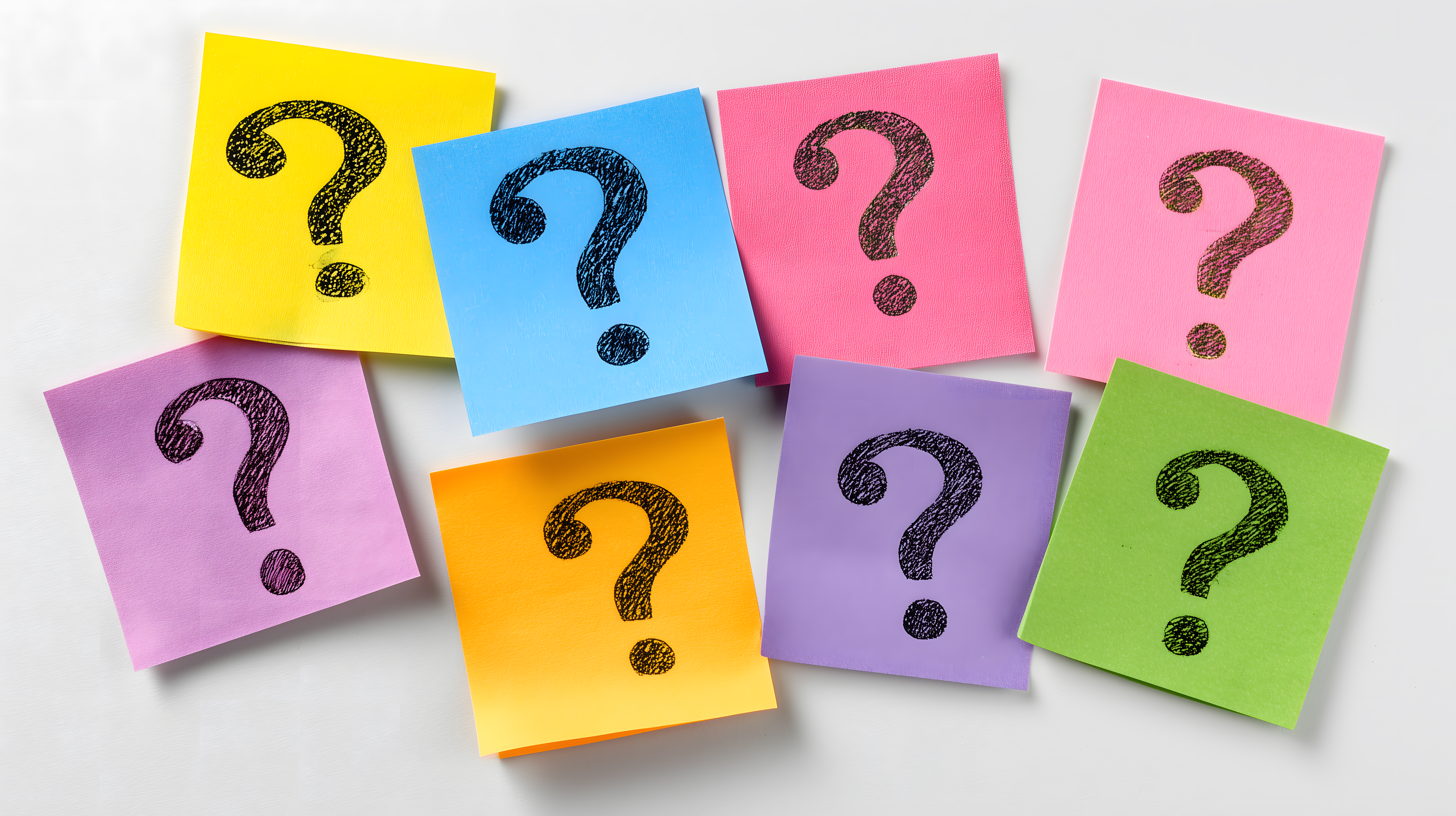 Dieses bunte Stockfoto zeigt verschiedenfarbige Haftnotizen mit Fragezeichen-Symbolen auf einem weißen Hintergrund. Die Notizen sind in verschiedenen Pastellfarben wie Gelb, Blau, Pink und Lila gehalten und verteilen sich unregelmäßig über die Fläche. Die grafischen Fragezeichen-Symbole darauf vermitteln ein Gefühl von Unsicherheit, Neugier und offenen Fragen.