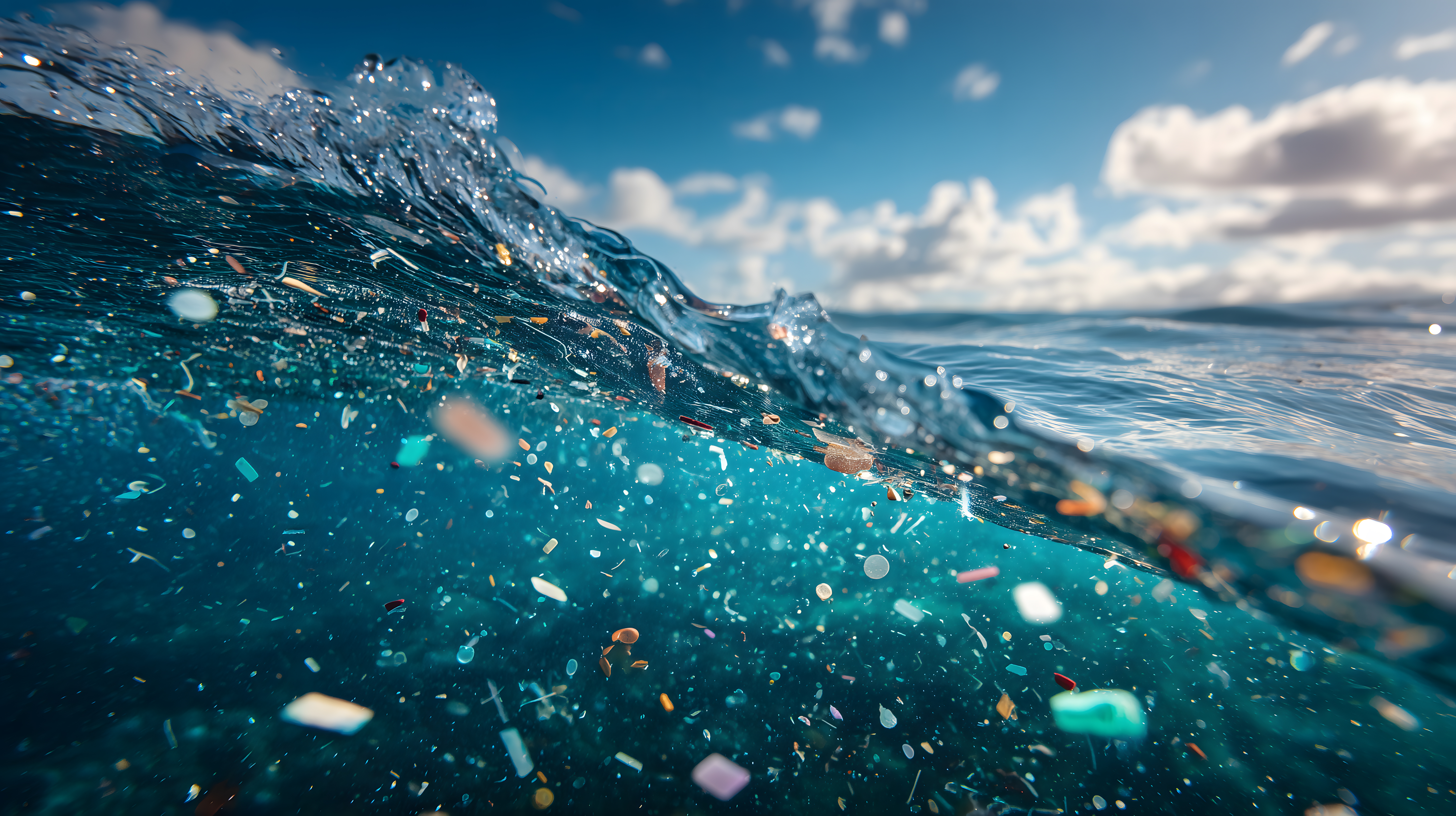 Das Foto zeigt eine Nahaufnahme von spritzenden Meereswellen, in denen zahlreiche Plastikteile und Abfälle zu erkennen sind. Der Kontrast zwischen dem klaren Blau des Wassers und Himmels und den vielen bunten Plastikpartikeln ist auffallend. Die Szene vermittelt einen Eindruck der Verschmutzung der Ozeane durch Plastik und andere Abfälle. Dieses Stockfoto eignet sich hervorragend für die Verwendung in Artikeln, Berichten oder Kampagnen zum Thema Umweltschutz und Nachhaltigkeit. Es ist in hoher Auflösung verfügbar und steht unter einer Creative-Commons-Lizenz zur freien Nutzung zur Verfügung.
