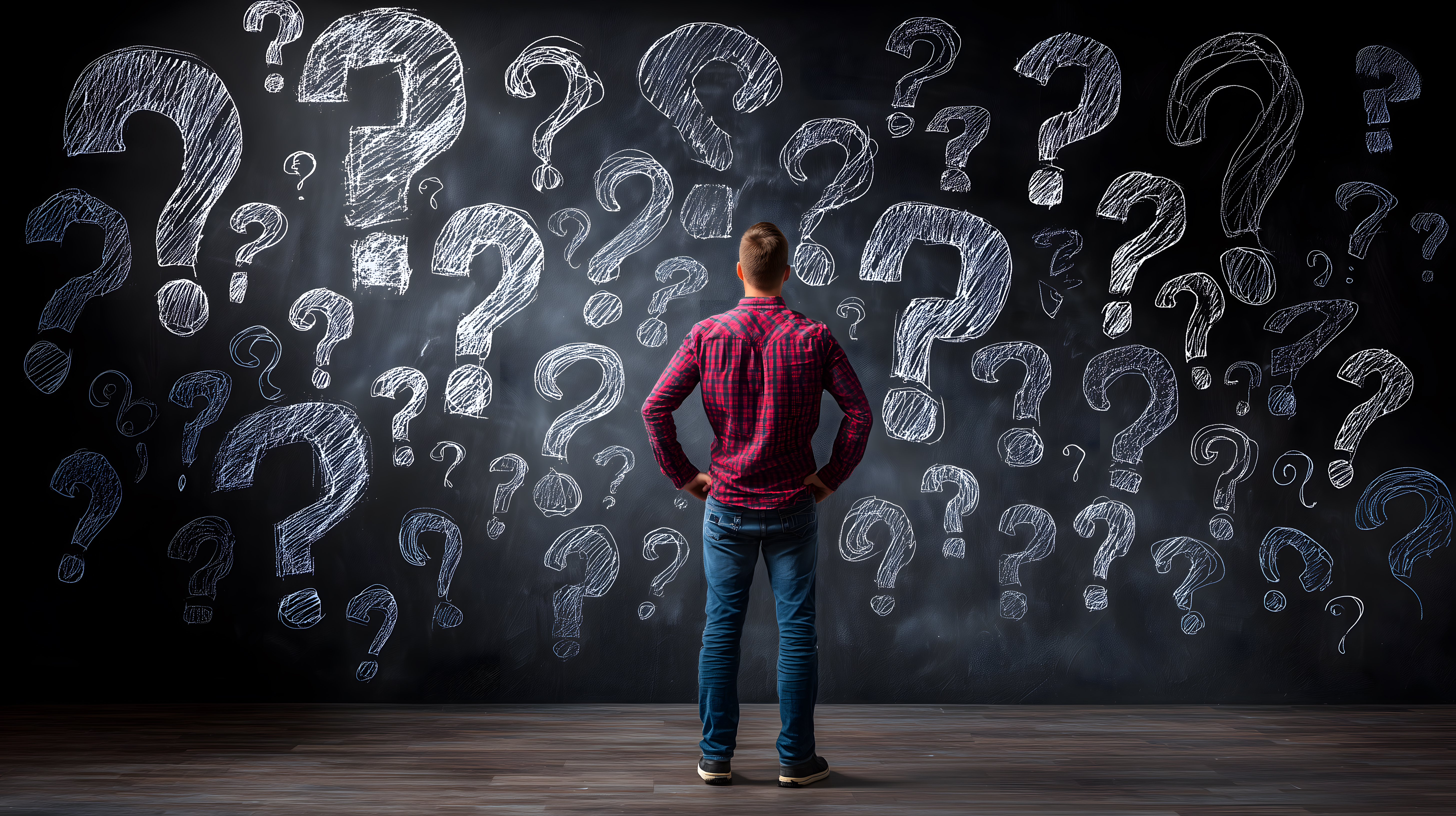Dieses Stockfoto zeigt einen nachdenklichen Mann, der in Seitenansicht vor einer schwarzen Kreidetafel mit unzähligen Fragezeichen steht. Die Kreidetafel symbolisiert die vielen Fragen und Ungewissheiten, die der Mann in sich trägt. Seine Körperhaltung und der versonnene Blick lassen darauf schließen, dass er intensiv über etwas nachdenkt und nach Lösungen sucht. Dieses Foto eignet sich hervorragend für den Einsatz in Blogs, Newslettern oder Sozialen Medien, um Themen wie Kreativität, Problemlösung, Herausforderungen oder Entscheidungsfindung visuell zu transportieren. Es ist ein kostenloses Stockfoto in hoher Auflösung, das unter der Creative-Commons-Lizenz genutzt werden kann.