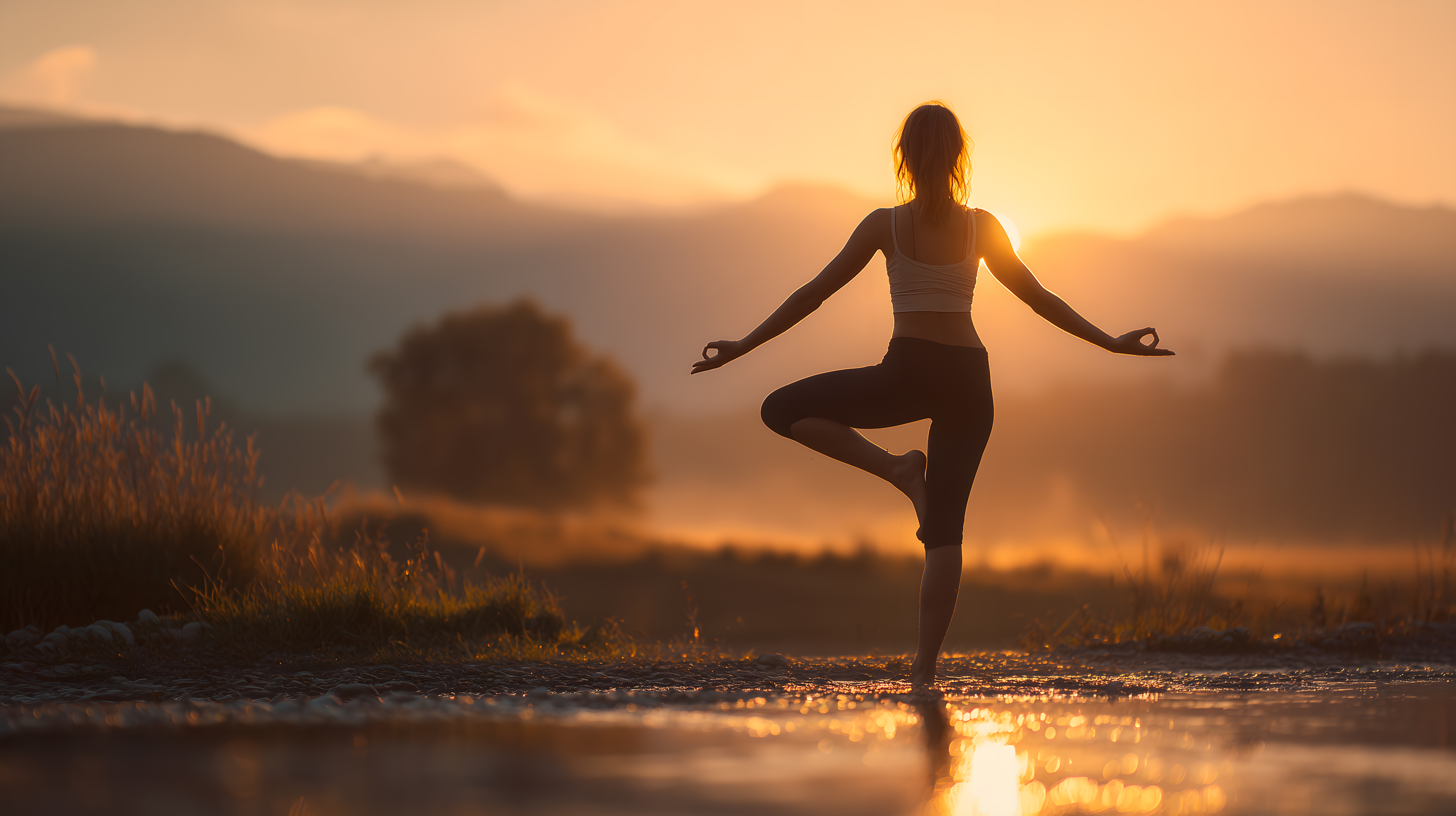 Dieses beeindruckende Foto zeigt eine Frau, die bei Sonnenaufgang in einer Yoga-Position am Ufer eines Bergsees posiert. Die Silhouette der Person hebt sich deutlich gegen den warmen, orangefarbenen Himmel und die bergige Landschaft ab. Das Bild strahlt eine große Ruhe und Harmonie aus, die durch die Entspannung und Konzentration der Frau während ihrer Yoga-Praxis vermittelt wird. Dieses Foto eignet sich hervorragend für den Einsatz in Blogs, Newslettern oder auf Social-Media-Kanälen, die sich mit Themen wie Gesundheit, Wellness und Naturverbundenheit beschäftigen. Als hochauflösendes Stockfoto unter einer Creative-Commons-Lizenz ist es kostenfrei für verschiedenste Zwecke nutzbar.