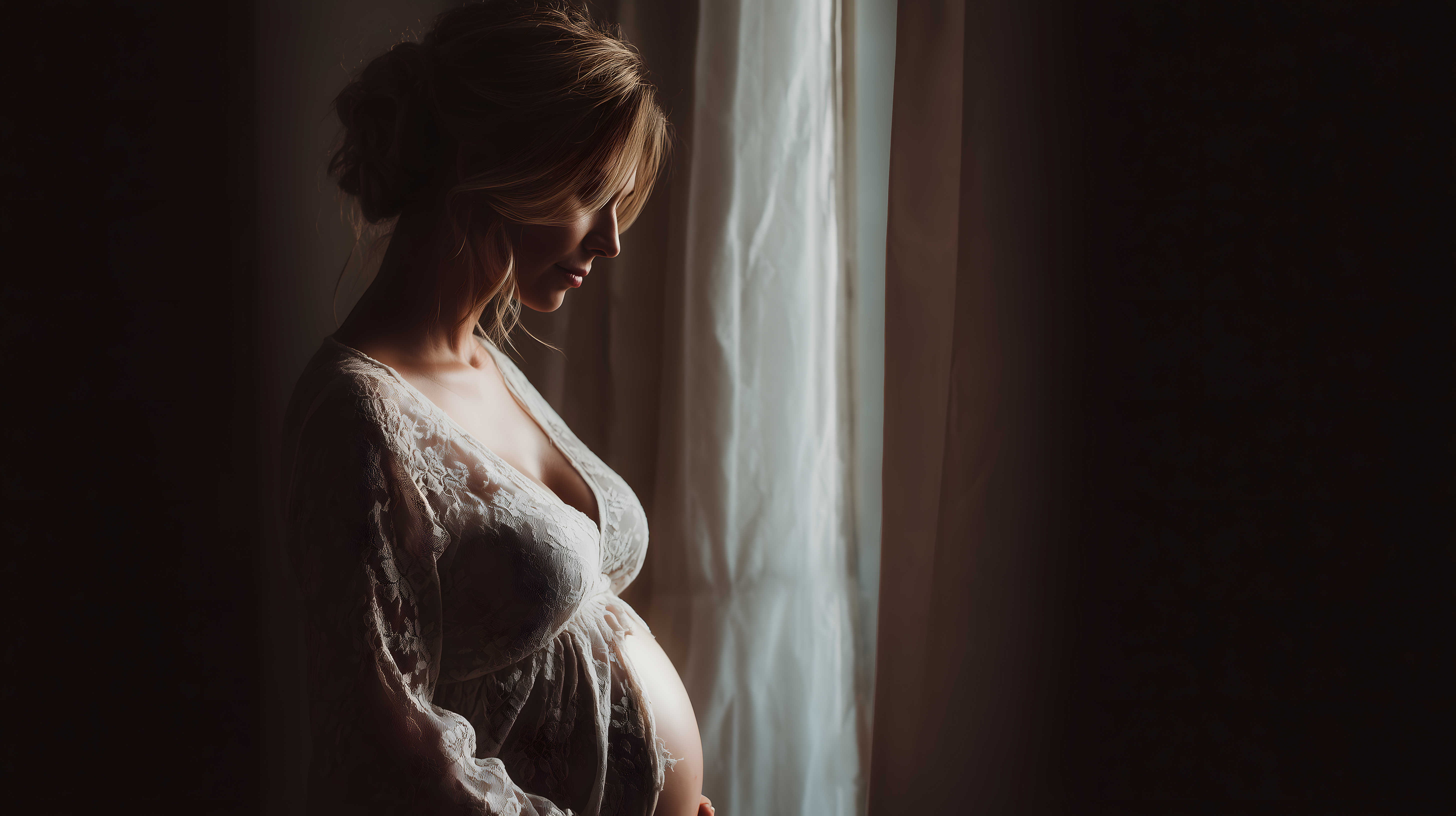 Das Foto zeigt eine schwangere Frau, die nachdenklich aus einem Fenster blickt. Das warme, gedämpfte Licht beleuchtet ihr Profil, während der Großteil des Bildes im Schatten liegt. Der Kontrast zwischen Hell und Dunkel verleiht der Szene eine besonders intime und ruhige Atmosphäre. Die Frau scheint in Gedanken versunken zu sein, was die Betrachtenden einlädt, ihre Gefühle und Gedanken in diesem besonderen Moment nachzuvollziehen. Dieses hochwertige Stockfoto eignet sich hervorragend für den Einsatz in Blogs, Newslettern, auf Social-Media-Kanälen oder in Werbekampagnen rund um die Themen Schwangerschaft, Mutterschaft und Familienplanung. Es steht in hoher Auflösung und unter der Creative-Commons-Lizenz zur kostenlosen Nutzung zur Verfügung.
