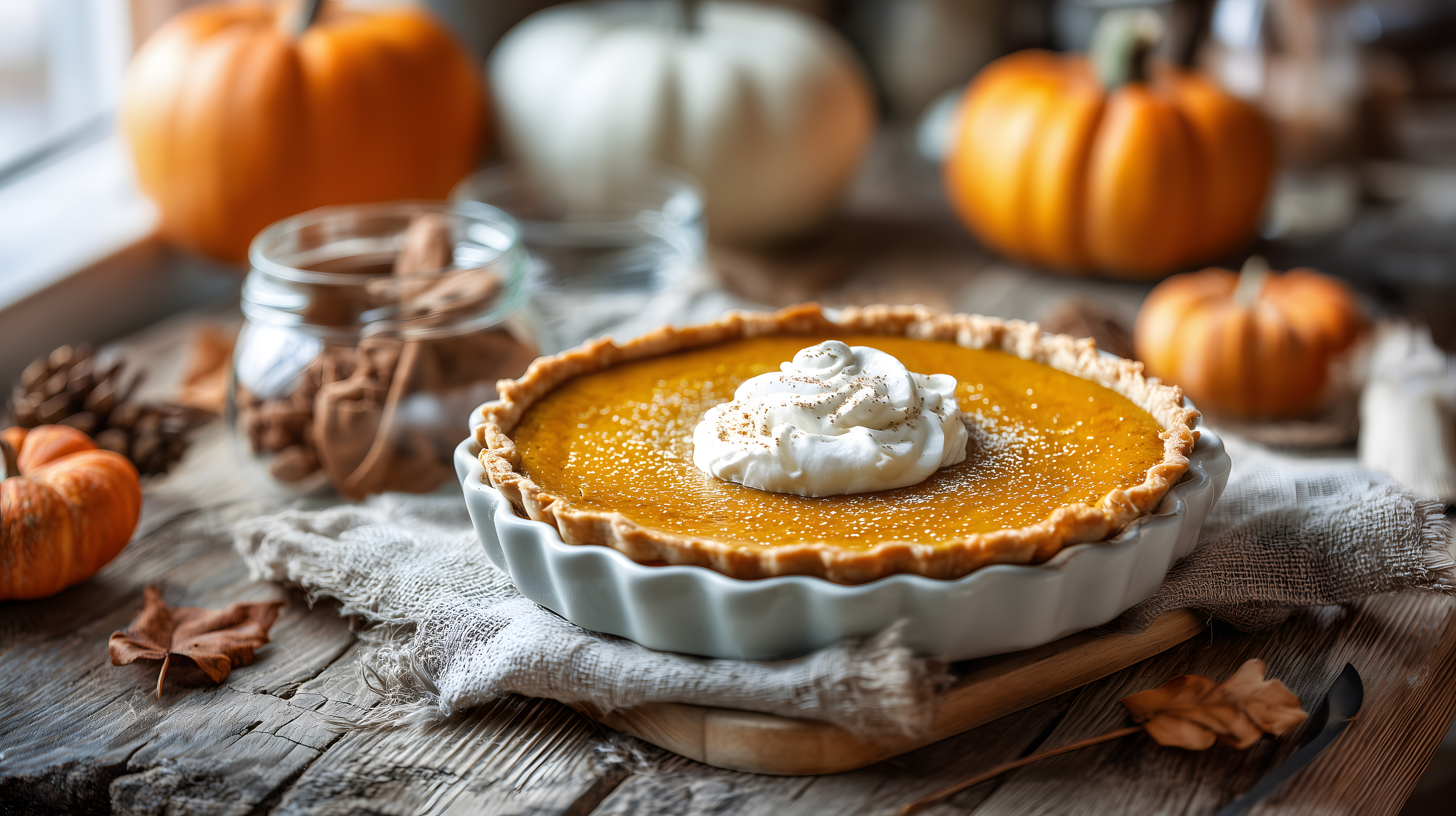 Das Bild zeigt einen frisch gebackenen Kürbiskuchen, der auf einem rustikalen Holztisch platziert ist. Der Kuchen ist mit einer Haube aus Sahne und Zimt verziert und wird umgeben von verschiedenen Kürbissen in Orange und Weiß sowie Zimtstangen. Die warmen Farben und der natürliche Hintergrund schaffen eine gemütliche, herbstliche Atmosphäre. Dieses stimmungsvolle Foto eignet sich perfekt als Stockfoto für Herbst- und Thanksgiving-Themen in Blogs, Newslettern, Social-Media-Beiträgen oder Werbematerialien. Das hochauflösende Bild steht unter einer Creative-Commons-Lizenz zur freien Nutzung zur Verfügung.