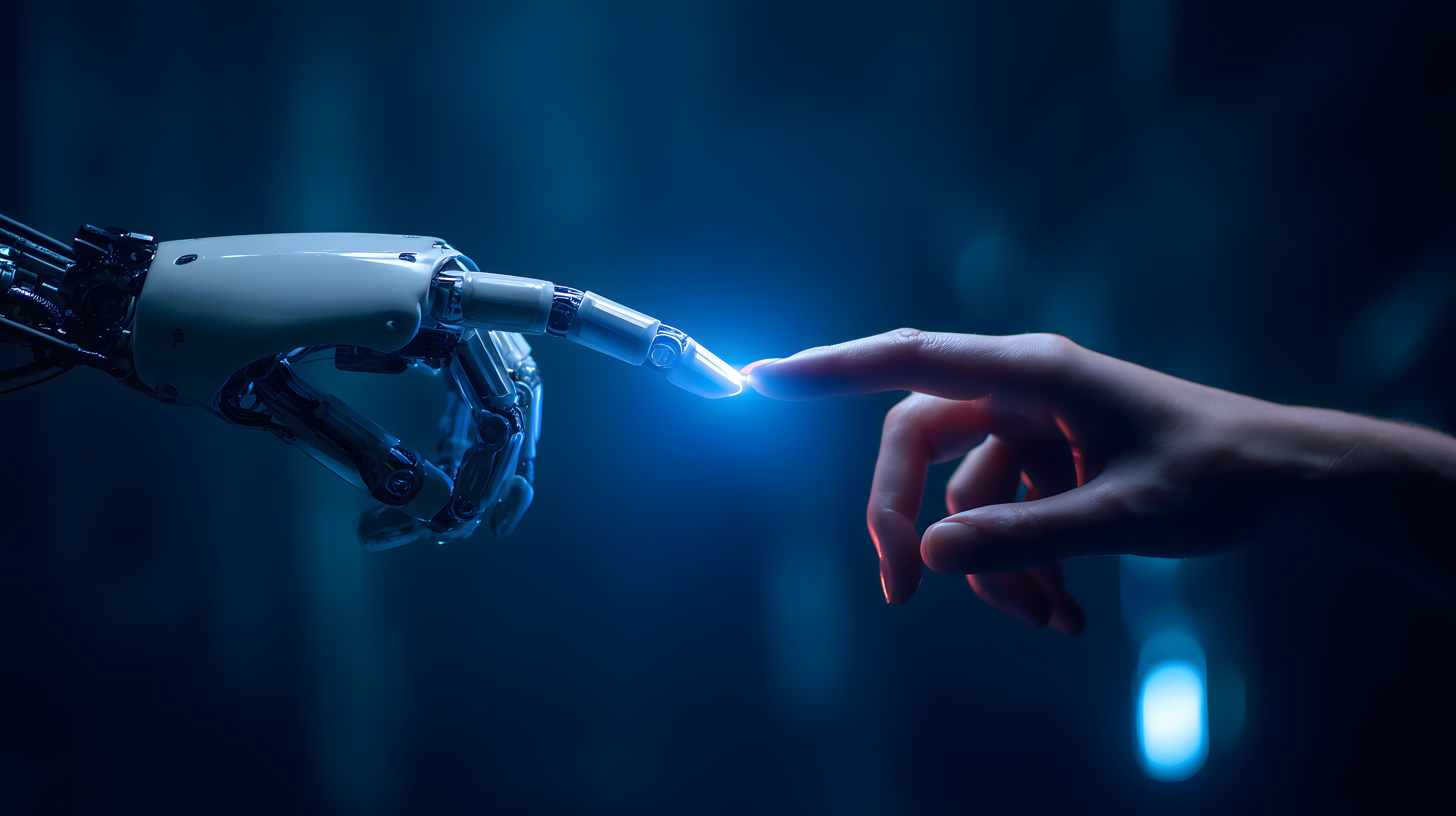 Dieses eindrucksvolle digitale Bild zeigt den Kontakt zwischen einer Roboterhand und einer menschlichen Hand. Die kühle, glänzende Metallkonstruktion der Roboterhand berührt vorsichtig den Finger der menschlichen Hand, als wäre eine digitale Verbindung zwischen beiden Welten hergestellt. Das Bild vermittelt Symbolik und Konzepte wie Technologischer Fortschritt, Zukunft, Digitalisierung und die zunehmende Verschmelzung von Mensch und Maschine. Mit den düsteren Blautönen und der hochkontrastreichen Beleuchtung erzeugt das Foto eine geheimnisvolle, fast schon beunruhigende Stimmung. Das Bild eignet sich sehr gut für Blogbeiträge, Newsletter, Social-Media-Posts und Werbemittel rund um Technologie, Innovation und Digitalisierung. Als hochwertiges, kostenloses Stockfoto unter Creative-Commons-Lizenz ist es universell einsetzbar.