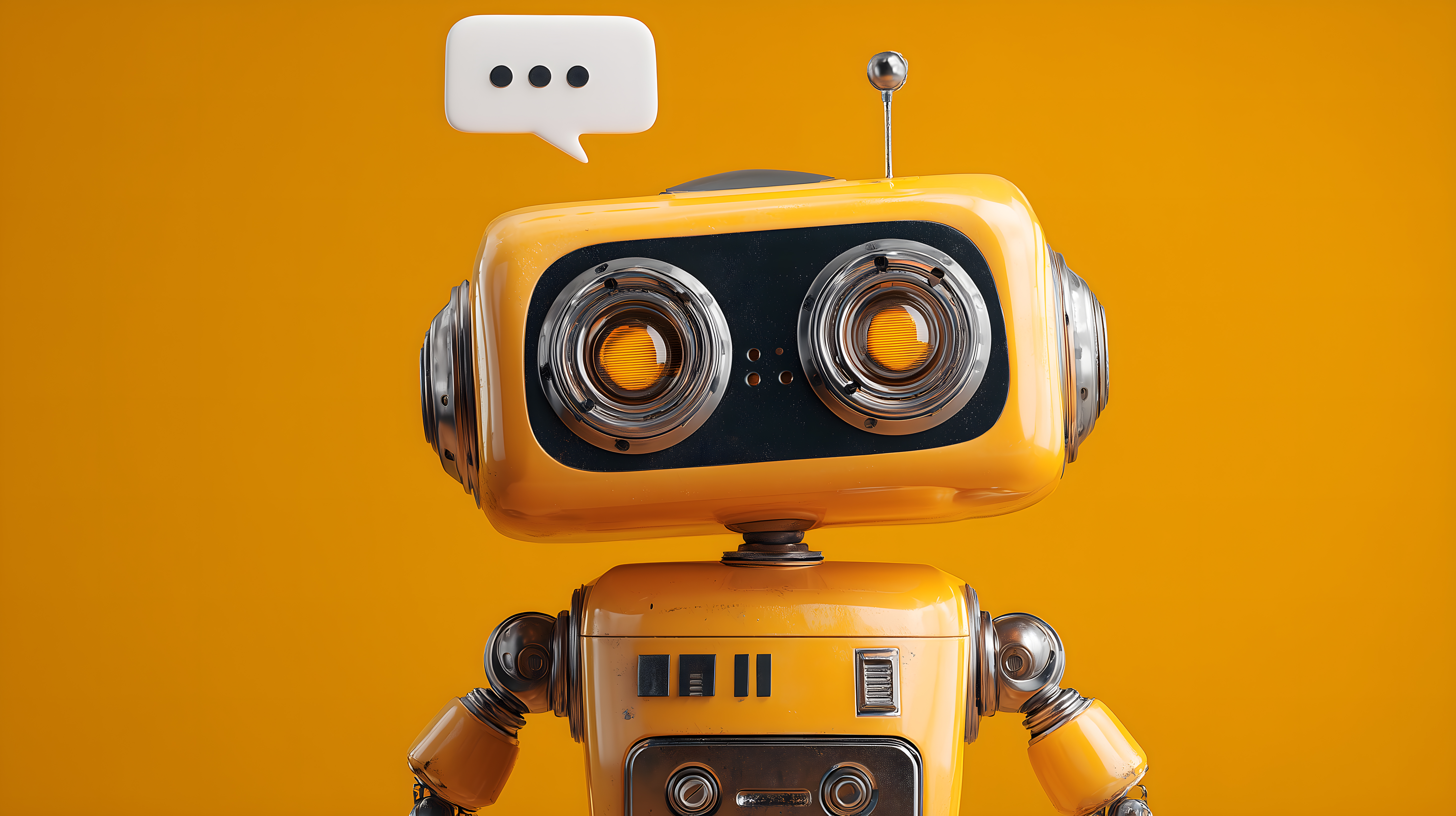Dieses Bild zeigt einen auffallenden, gelben Chatbot-Roboter vor einem intensiv orangefarbenen Hintergrund. Der Roboter hat eine rechteckige Grundform mit einer sprechblasenartigem Aufsatz auf dem Kopf, der seine Kommunikationsfähigkeit symbolisiert. Die Vorderseite ist mit schwarzen Elementen und großen, leuchtenden Augen gestaltet, die dem Roboter einen lebendig-freundlichen Ausdruck verleihen. Das Foto wurde im Studio aufgenommen, sodass der Roboter als Blickfang im Vordergrund wirkt und der Hintergrund rein auf die Farbwirkung reduziert ist.