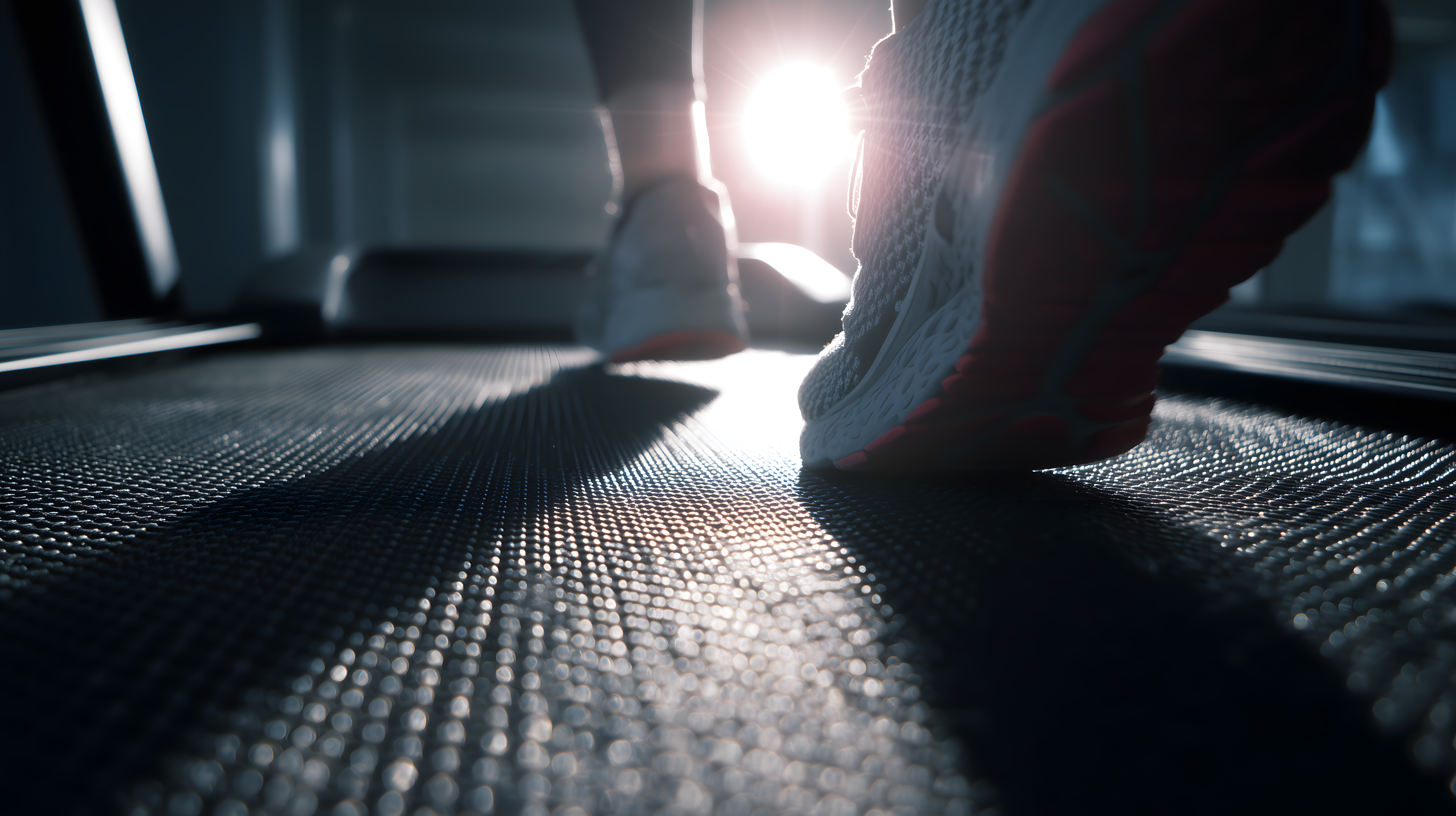 Dieses Foto zeigt die Nahaufnahme eines Läufers, der auf einem modernen, strukturierten Laufband in einem Fitnessstudio läuft. Der Hintergrund ist dunkel, was den Fokus auf die Bewegung des Läufers lenkt. Die unscharfe Bewegungsunschärfe vermittelt den Eindruck von Dynamik und Geschwindigkeit. Dieses Stockfoto eignet sich ideal für Verwendungen in Bereichen wie Sport, Fitness, Gesundheit und Wellness - etwa für Blogbeiträge, Newsletter, Social-Media-Kanäle oder Werbematerialien. Es ist in hoher Auflösung und unter einer Creative-Commons-Lizenz frei verfügbar.