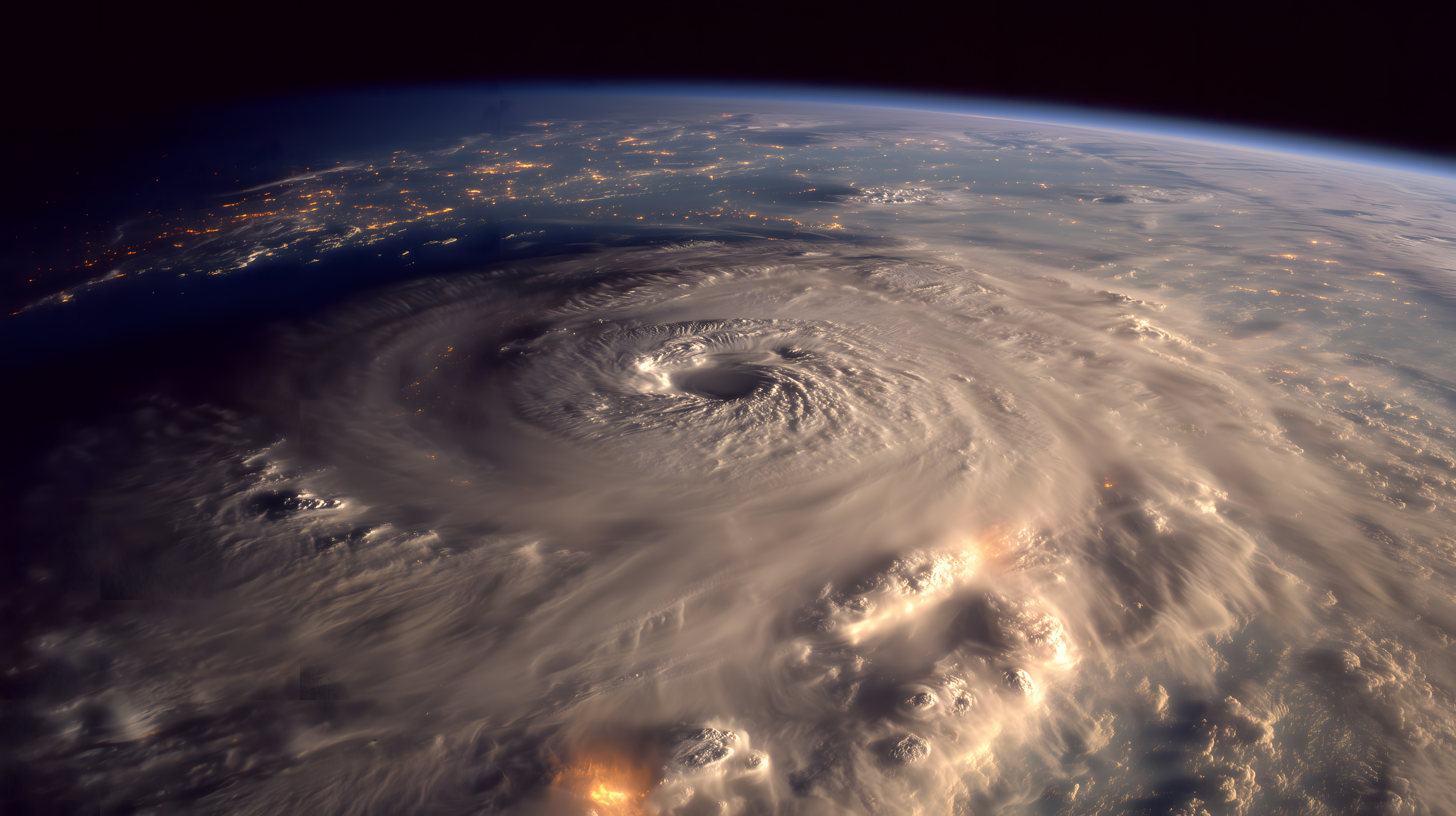 Dieses beeindruckende Foto zeigt einen gewaltigen Hurrikan, wie er sich von der Perspektive des Weltraums aus präsentiert. Zu sehen sind die charakteristischen kreisförmigen Wolkenformationen des Sturms, die sich über weite Teile des Planeten Erde erstrecken. Die dunkle Nacht lässt die leuchtenden Städte am Boden deutlich hervortreten, während der Hurrikan selbst in einem bedrohlichen Dunkel thront.