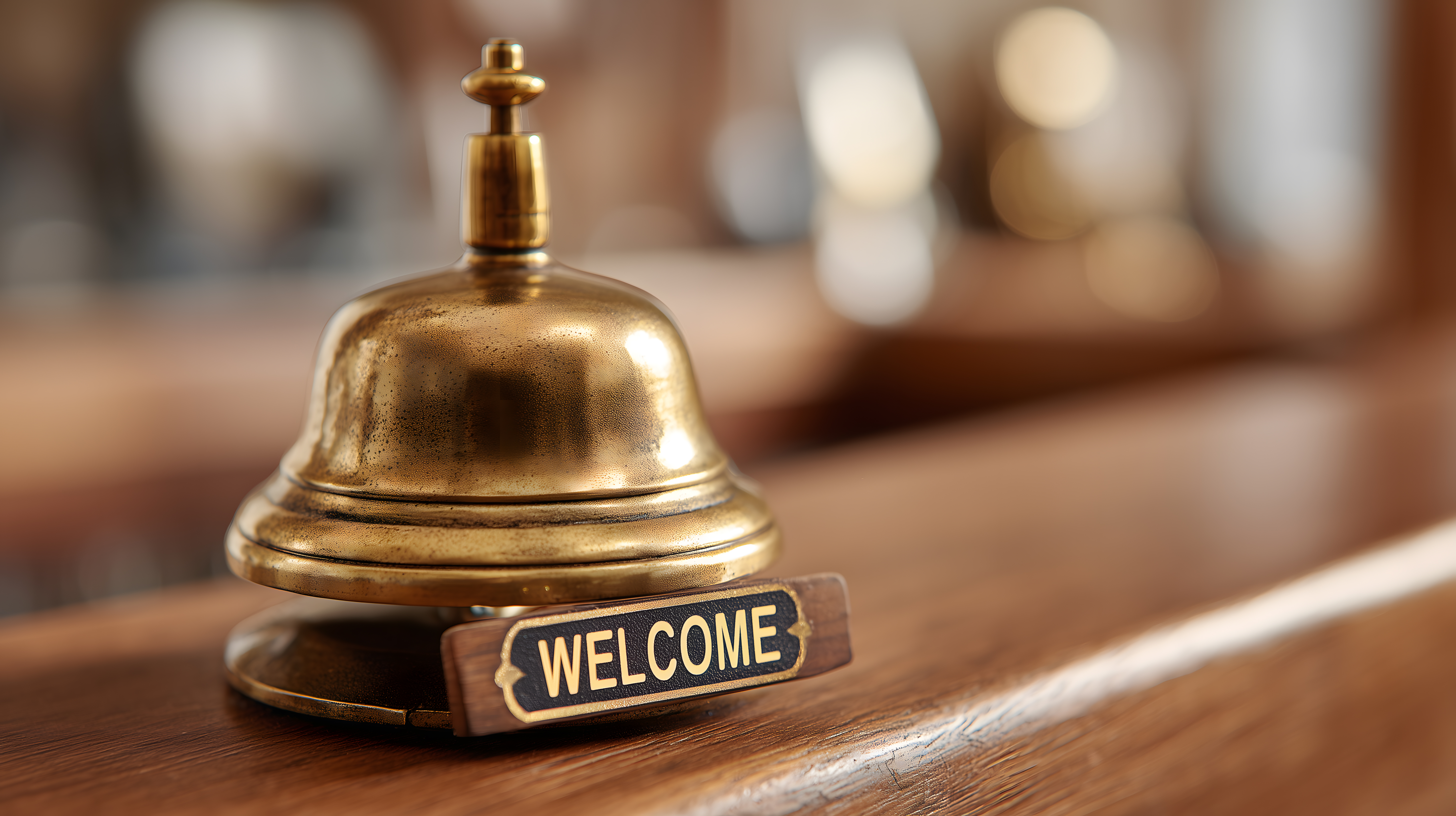 Dieses elegante Foto zeigt eine detailreiche Hotelklingel auf einer rustikalen Holztheke. Die massiv wirkende, goldfarbene Klingel steht im Mittelpunkt und verleiht dem Ambiente einen vornehmen, nostalgischen Charakter. Das kleine Willkommensschild darunter unterstreicht die Gastfreundschaft und den Empfangscharakter des Ortes. Das Bild eignet sich hervorragend als Stockfoto für die Gestaltung von Blogs, Websites, Newslettern oder Social-Media-Beiträgen rund um die Themen Hotellerie, Gastronomie, Reise und Tourismus. Dieses hochauflösende und lizenzfreie Foto steht unter einer Creative-Commons-Lizenz zur Verfügung.