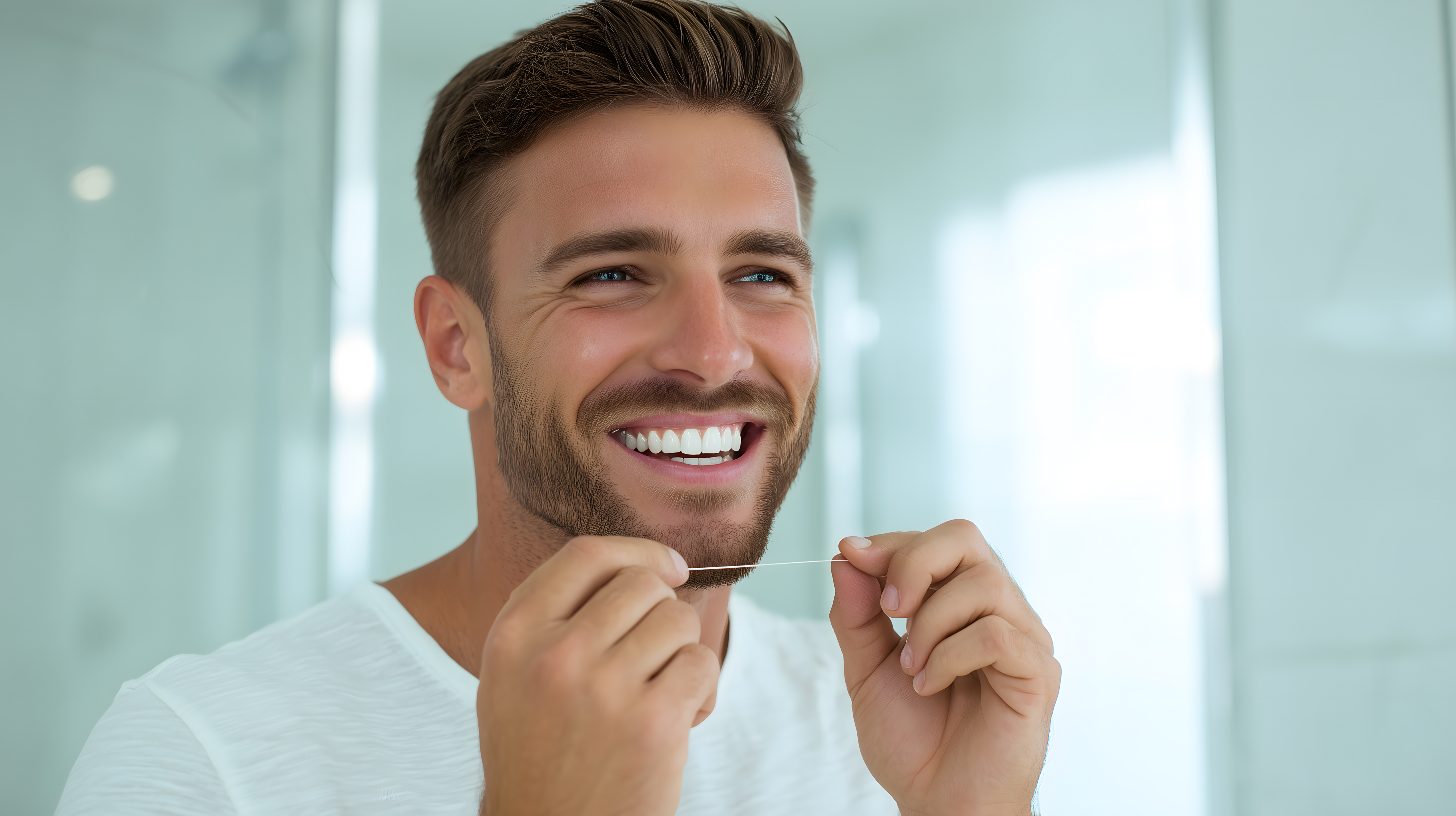 Dieses Foto zeigt einen lächelnden Mann, der Zahnseide in einem hellen, modernen Badezimmer benutzt. Seine offene Körpersprache und sein freudiger Gesichtsausdruck vermitteln ein Gefühl von Selbstfürsorge und Wohlbefinden. Das Bild kann für verschiedene Einsatzzwecke, wie Blogbeiträge, Newsletter oder soziale Medien, verwendet werden und eignet sich hervorragend als hochwertiges, kostenloses Stockfoto unter Creative-Commons-Lizenz.