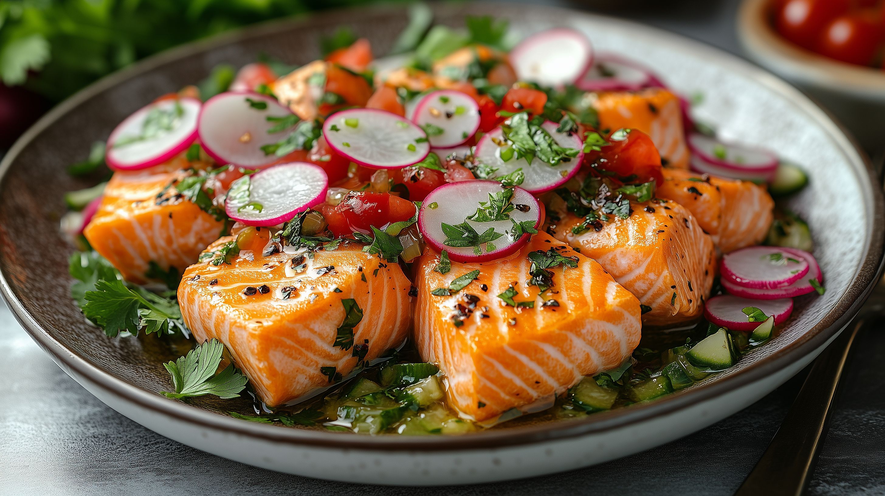 Das Foto zeigt einen köstlichen Lachs-Salat, der auf einem rustikalen Teller angerichtet ist. Der Lachs ist in mundgerechte Stücke geschnitten und mit frischem Gemüse wie Radieschen, Tomaten und Kräutern wie Petersilie angerichtet. Die Zutaten sind farblich stimmig aufeinander abgestimmt und verleihen dem Gericht ein appetitliches Aussehen. Dieses hochwertige Stockfoto eignet sich hervorragend für Verwendungen in Blogs, Newslettern, Social-Media-Kanälen oder Werbematerialien rund um gesunde Ernährung, Rezepte oder die Gastronomie. Das Bild ist in hoher Auflösung und unter Creative-Commons-Lizenz verfügbar.