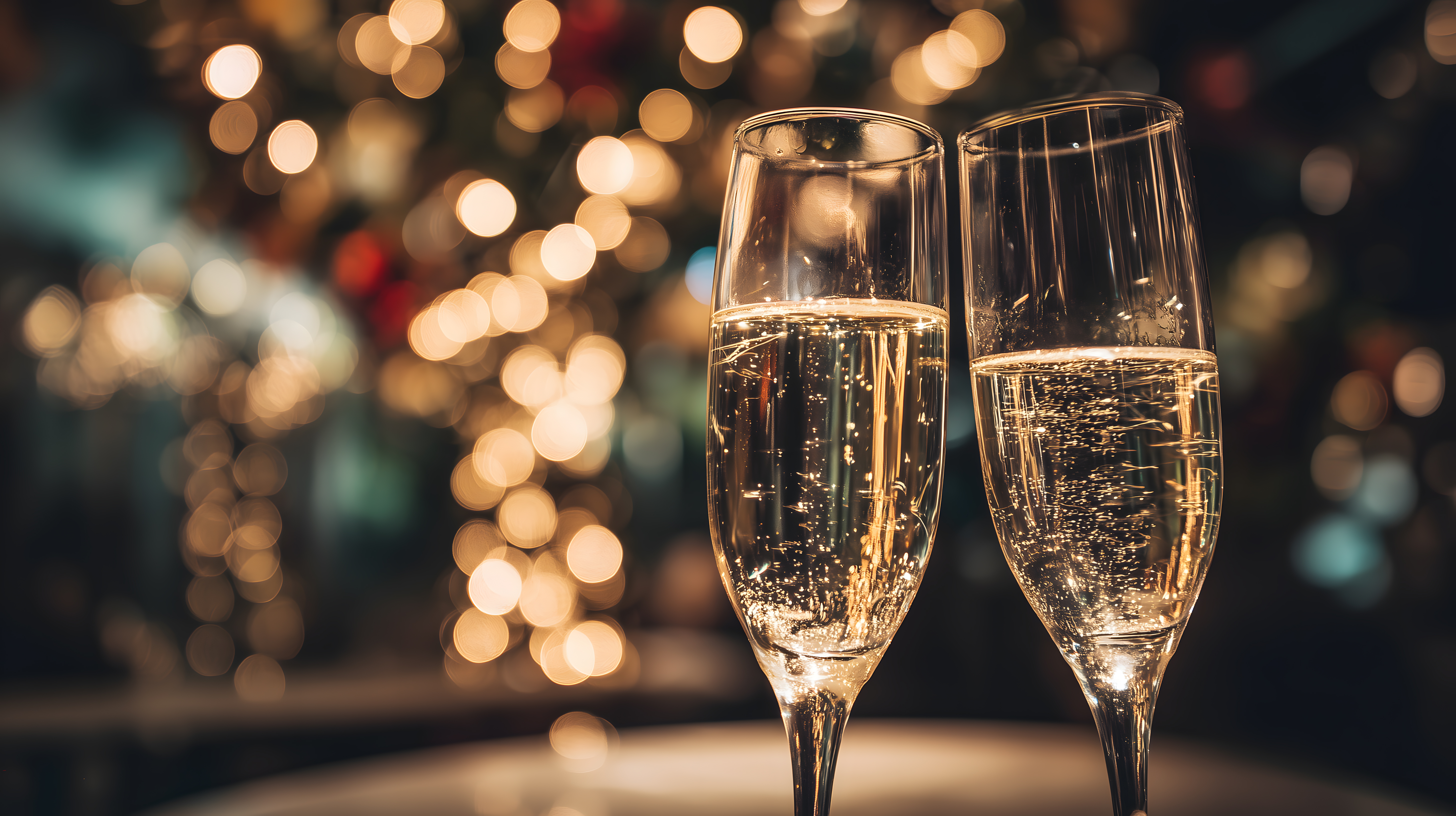 Das Bild zeigt zwei elegante Sektgläser, die vor einem verschwommenen, feierlichen Hintergrund mit funkelnden Lichterketten angestoßen werden. Die Sektgläser sind mit goldfarbener, perlender Flüssigkeit gefüllt und stehen im Mittelpunkt der Komposition. Die warmen, goldenen Farbtöne und der unscharfe, stimmungsvolle Hintergrund vermitteln eine festliche, gehobene Atmosphäre, wie sie typisch für Weihnachts- oder Silvesterfeierlichkeiten ist.