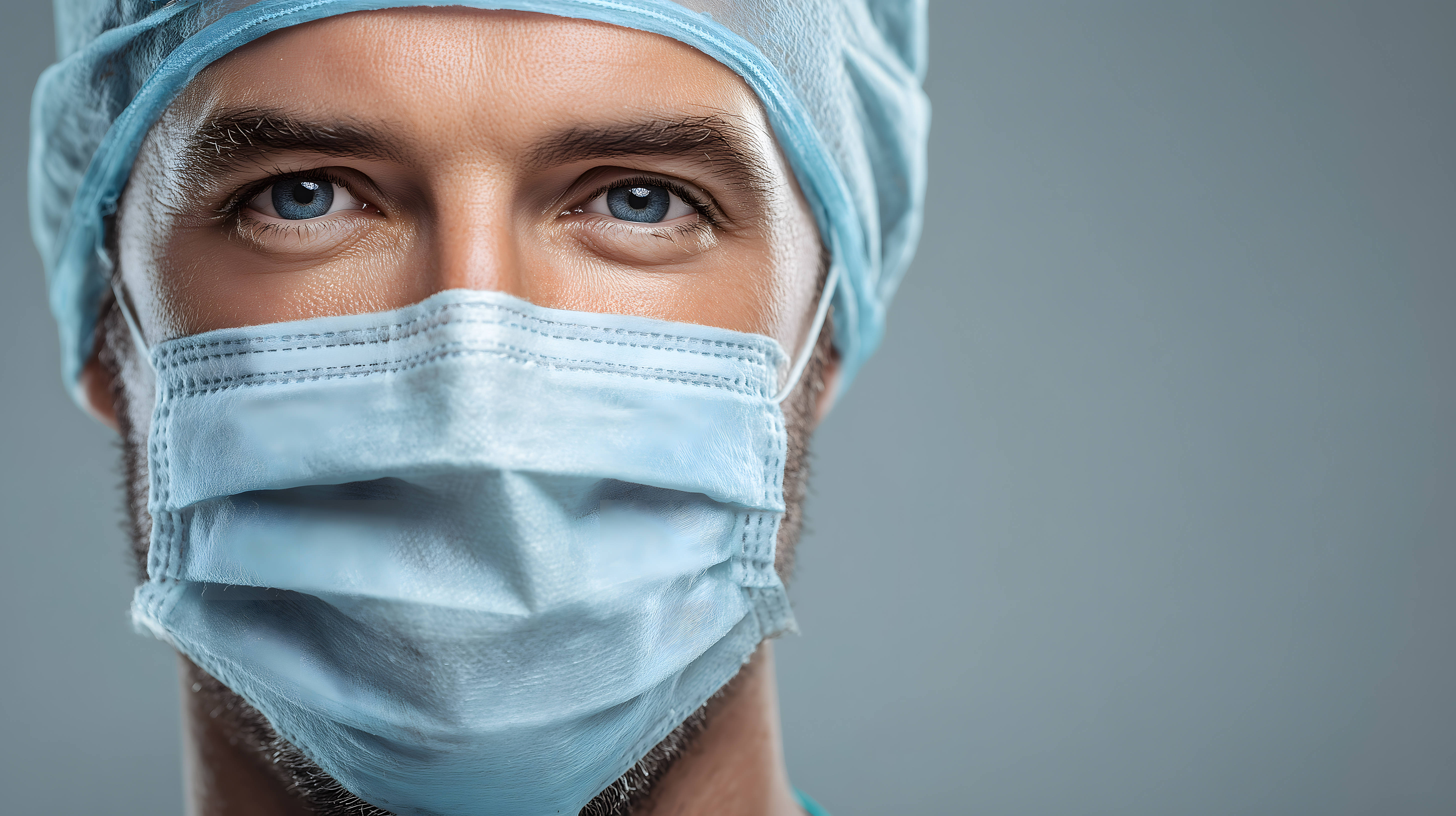 Dieses Stockfoto zeigt das Porträt eines Arztes oder Krankenpflegers, der eine blaue Medizinmaske trägt. Der Fokus liegt auf den intensiven Augen des Mannes, der den Betrachter ernst und konzentriert anblickt. Der graue Hintergrund lässt den Blick auf das Gesicht des medizinischen Personals in Schutzausrüstung fokussieren. Das Foto eignet sich hervorragend für Beiträge, Artikel oder Werbung rund um die Themen Gesundheit, Medizin, Prävention und Sicherheit, insbesondere im Zusammenhang mit der Covid-19-Pandemie. Das hochauflösende Stockfoto steht unter einer Creative-Commons-Lizenz zur Verfügung.