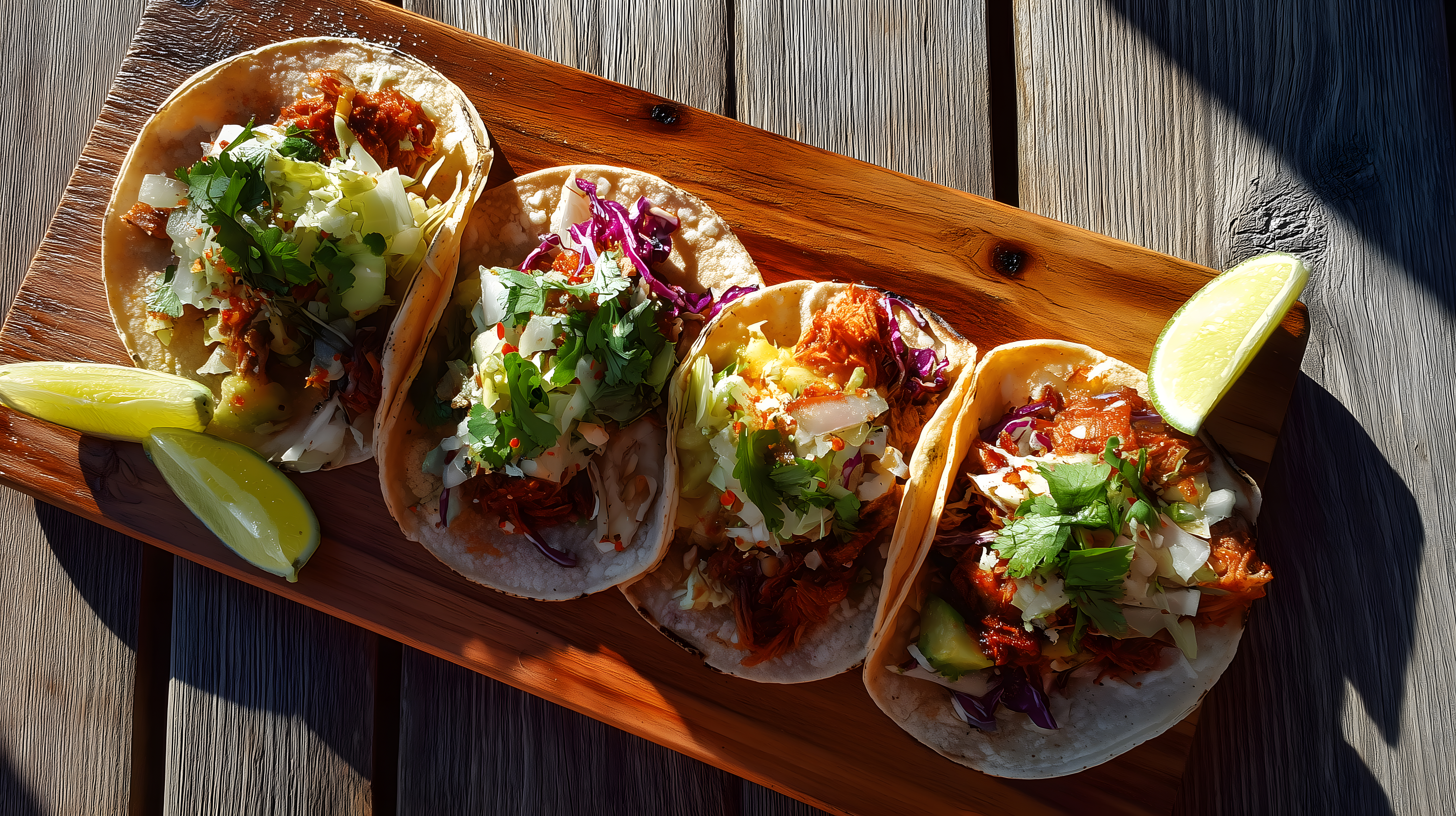 Dieses köstliche Stockfoto zeigt mehrere leckere Gourmet-Tacos auf einem rustikalen Holzbrett. Die Tacos sind mit frischen Zutaten wie Gemüse, Kräutern und Zitronenscheiben belegt und sehen äußerst appetitanregend aus. Der rustikale, authentische Stil des Fotos lässt erahnen, dass es sich um ein hochwertiges, kostenloses Stockfoto in hoher Auflösung unter einer Creative-Commons-Lizenz handelt. Dieses Bild eignet sich hervorragend für die Verwendung in Blogs, Newslettern, Social-Media-Kanälen oder für Werbezwecke in der Gastronomie- und Foodbranche.