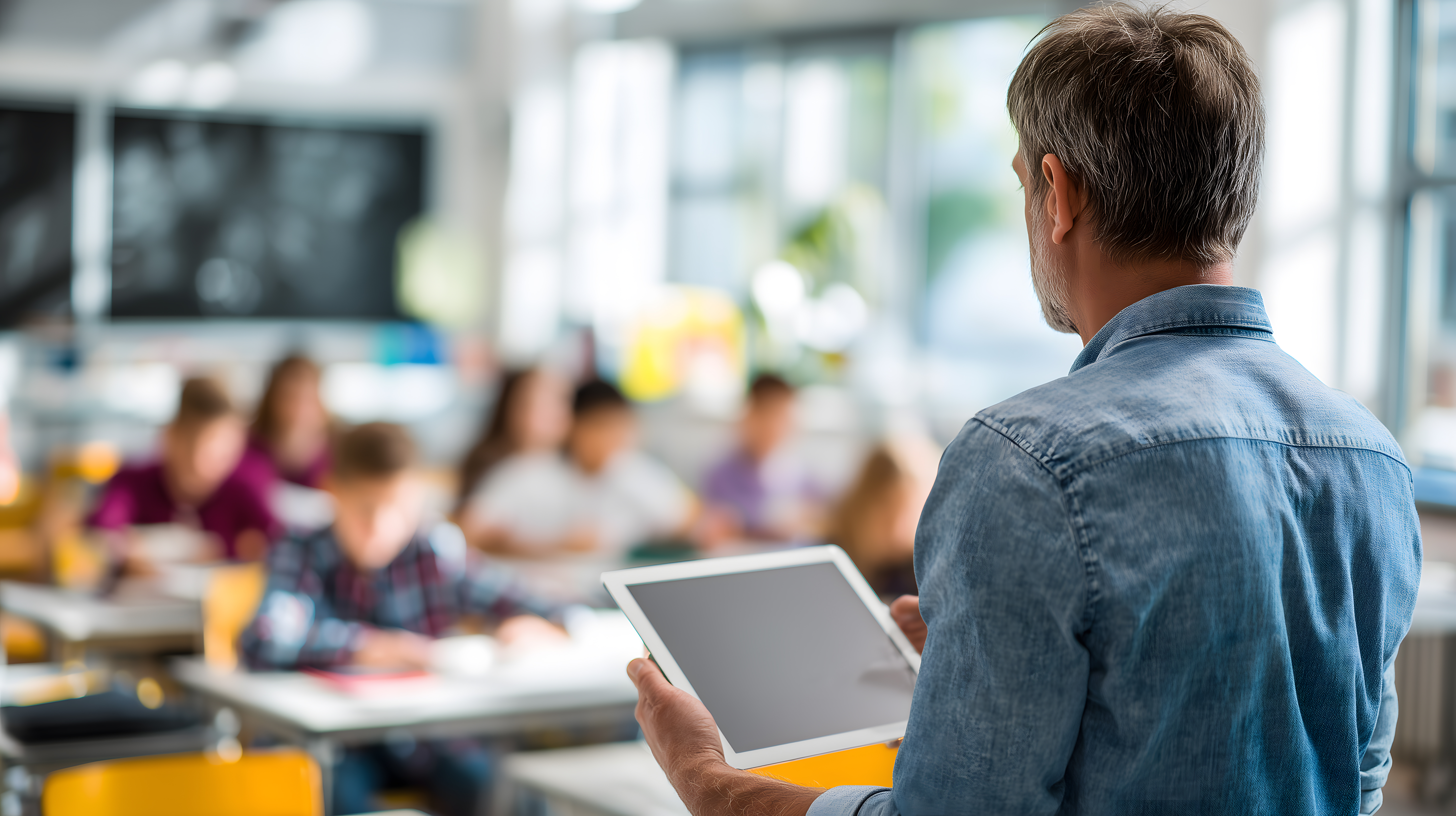 Das Bild zeigt einen Lehrer, der vor einer Gruppe von Schülern steht und ein Tablet in den Händen hält. Er scheint den Unterricht mit Hilfe der digitalen Technologie zu gestalten. Die Schüler sitzen konzentriert an ihren Tischen und scheinen aufmerksam dem Unterricht zu folgen. Das Klassenzimmer ist modern eingerichtet mit großen Fenstern, einer Tafel und verschiedenen Lernmaterialien. Dieses Foto eignet sich hervorragend als kostenloses Stockfoto für Beiträge rund um den Einsatz von Technologie im Bildungskontext, moderne Lernmethoden oder die digitale Transformation an Schulen. Es ist in hoher Auflösung und unter einer Creative Commons-Lizenz verfügbar.