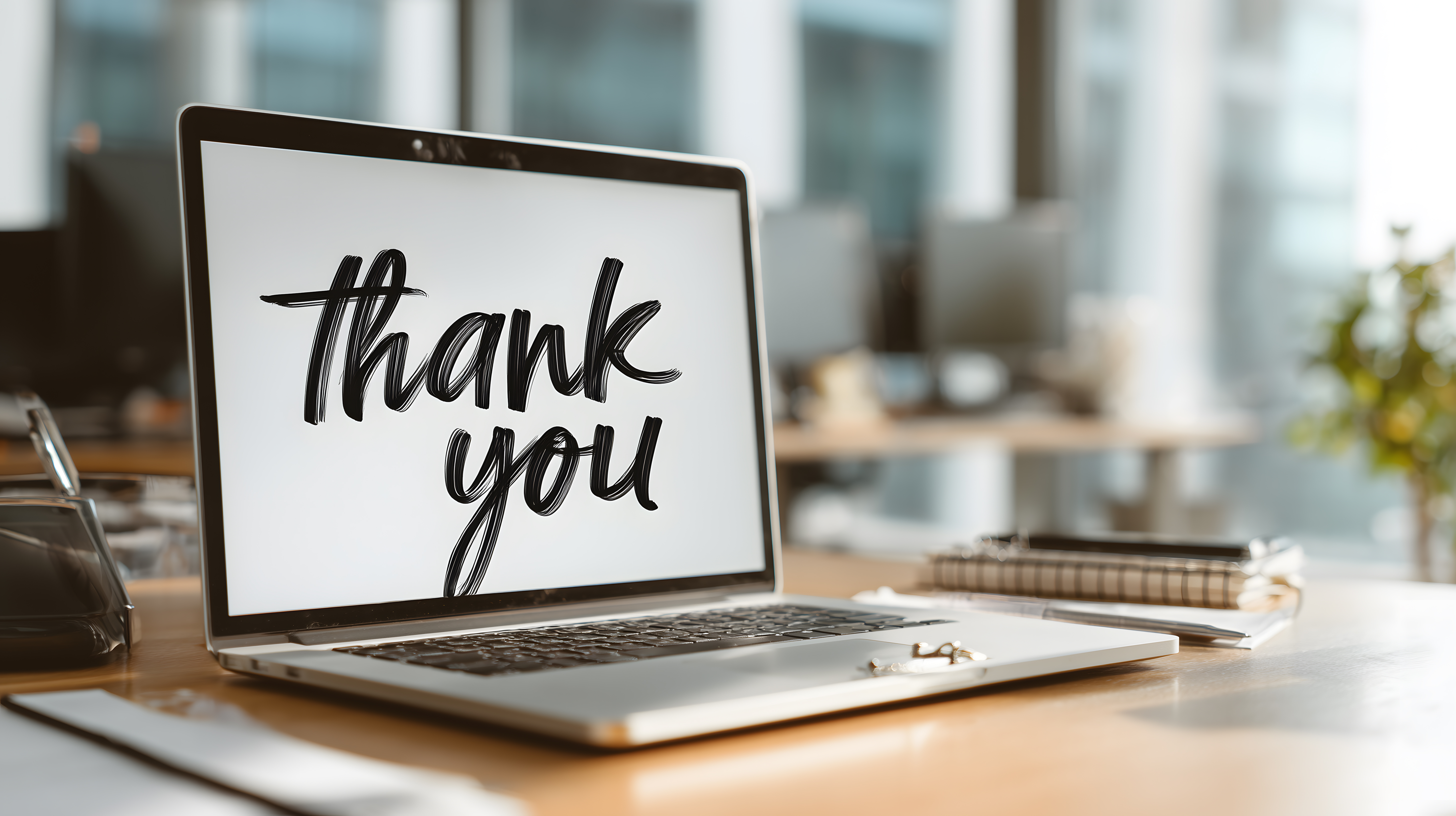 Dieses Bild zeigt einen modernen Laptop-Bildschirm, auf dem der Schriftzug 'Thank you' in einer kalligrafischen Schrift zu sehen ist. Der Laptop befindet sich auf einem Holztisch vor großen Fenstern, die eine unscharfe, aber freundliche Umgebung erkennen lassen. Das Bild vermittelt eine positive, digitale Dankbarkeit und könnte für verschiedene Anwendungen wie Blogbeiträge, Newsletter, Social-Media-Beiträge oder Werbematerial verwendet werden.