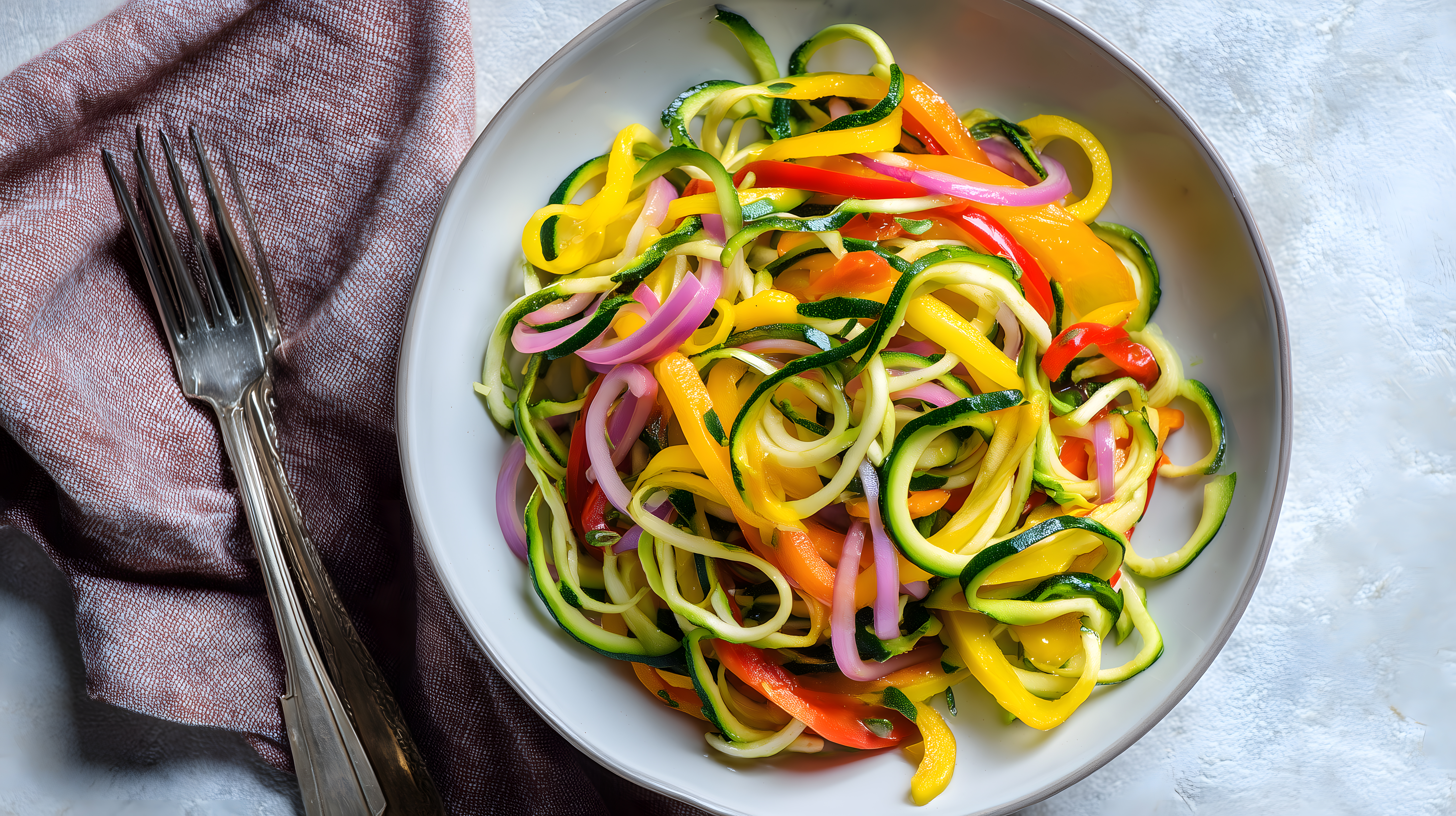 Das Foto zeigt eine Schüssel voller bunter Zucchini-Nudeln und Gemüse. Die Nudeln sind spiralförmig geschnitten und liegen zusammen mit gelben, roten und grünen Paprikastücken, roten Zwiebeln sowie Gurkenstreifen auf einem hellen Teller. Das Arrangement wirkt frisch, gesund und appetitlich. Das Bild eignet sich hervorragend als kostenloses Stockfoto für Blogs, Newsletter oder Social-Media-Posts rund um gesunde Ernährung, vegetarische Küche oder leichte Sommerrezepte. Die hochauflösende Datei steht unter einer Creative-Commons-Lizenz zur freien Verwendung bereit.