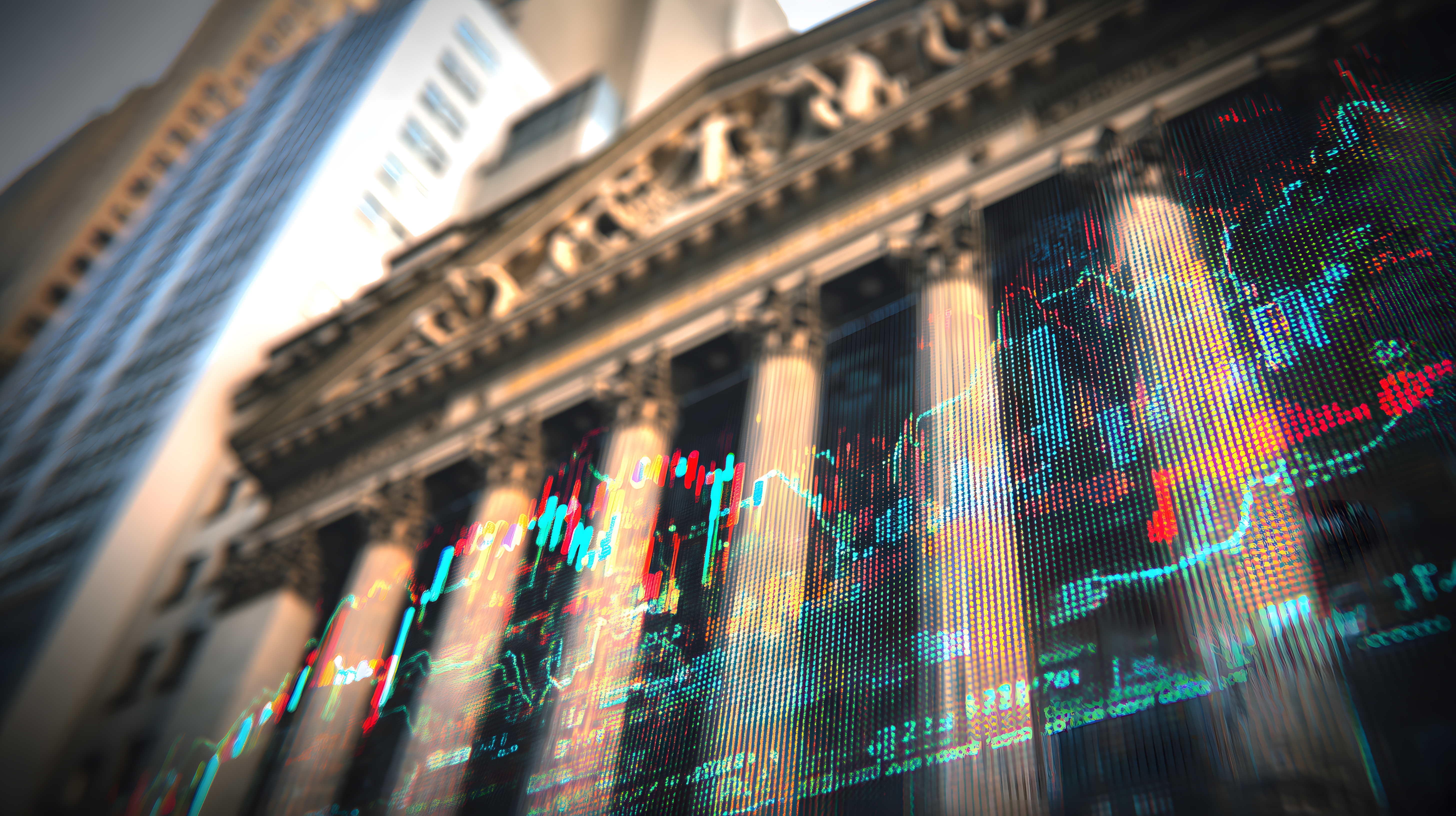 Das Bild zeigt ein historisches Börsengebäude mit Säulenfront vor dem Hintergrund dynamischer, farbiger Aktiencharts. Die grafischen Elemente vermitteln den Eindruck von Bewegung und Fortschritt in der Finanzwelt. Das Foto kann in Artikeln und Präsentationen rund um Themen wie Finanzen, Wirtschaft, Investitionen oder Digitalisierung eingesetzt werden. Es ist ein hochwertiges, kostenloses Stockfoto in hoher Auflösung unter Creative-Commons-Lizenz.