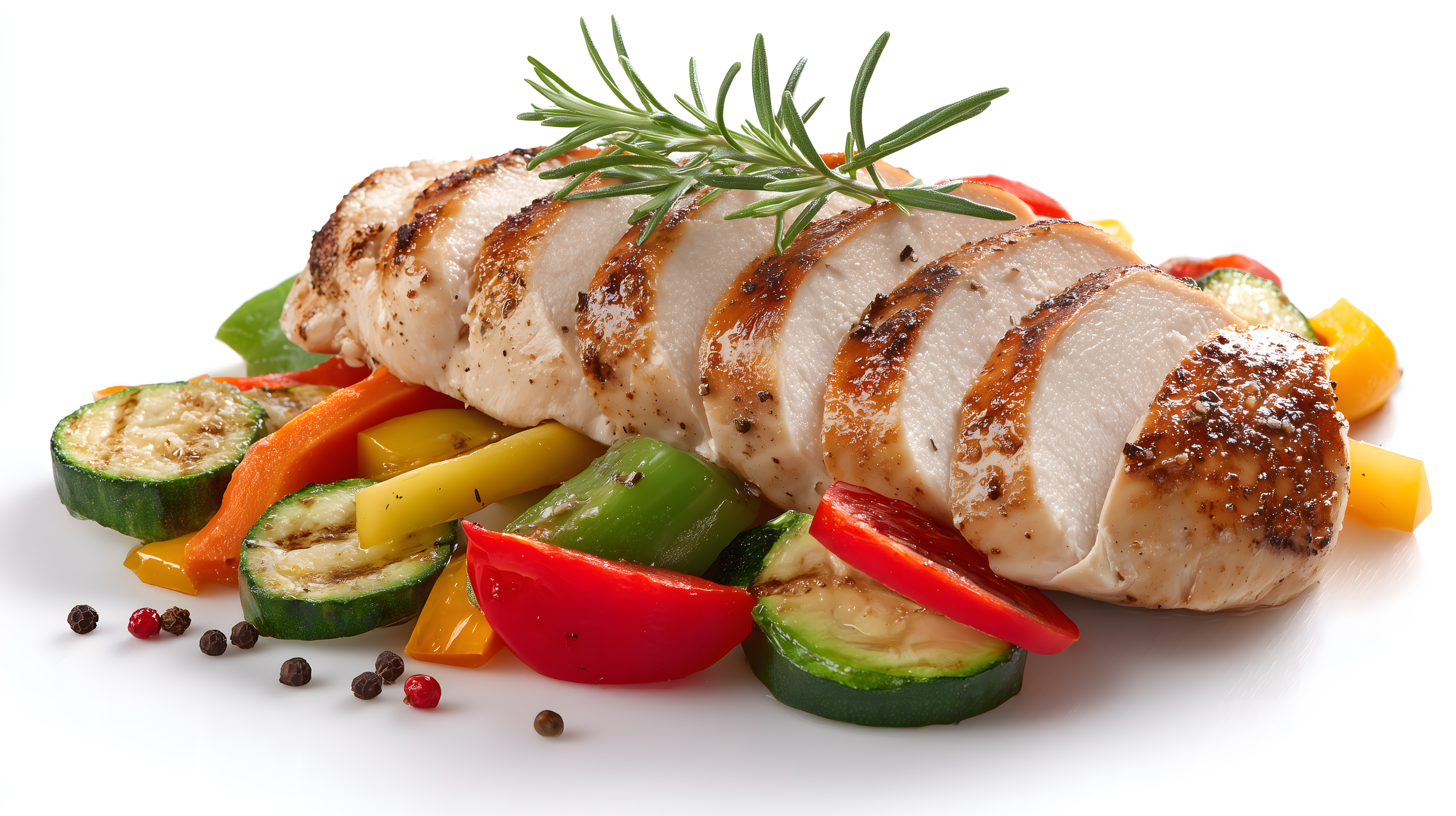 Das Foto zeigt eine leckere Mahlzeit aus goldbraunen Putenbrust-Scheiben, die auf einem Bett von buntem, frischem Gemüse wie Zucchini, Paprika und Tomaten angerichtet sind. Das Ganze ist mit Rosmarin-Zweigen dekoriert, was dem Gericht einen aromatischen Akzent verleiht. Das Bild besticht durch seine appetitliche Optik, die realistisch und gleichzeitig stilvoll inszeniert ist. Diese professionelle Stockfoto-Aufnahme in hoher Auflösung eignet sich hervorragend für den Einsatz in Blogs, Newslettern, Werbekampagnen oder auf Social-Media-Kanälen, um gesunde, ausgewogene Ernährung zu präsentieren. Das kostenlose Foto steht unter einer Creative-Commons-Lizenz zur Verfügung.