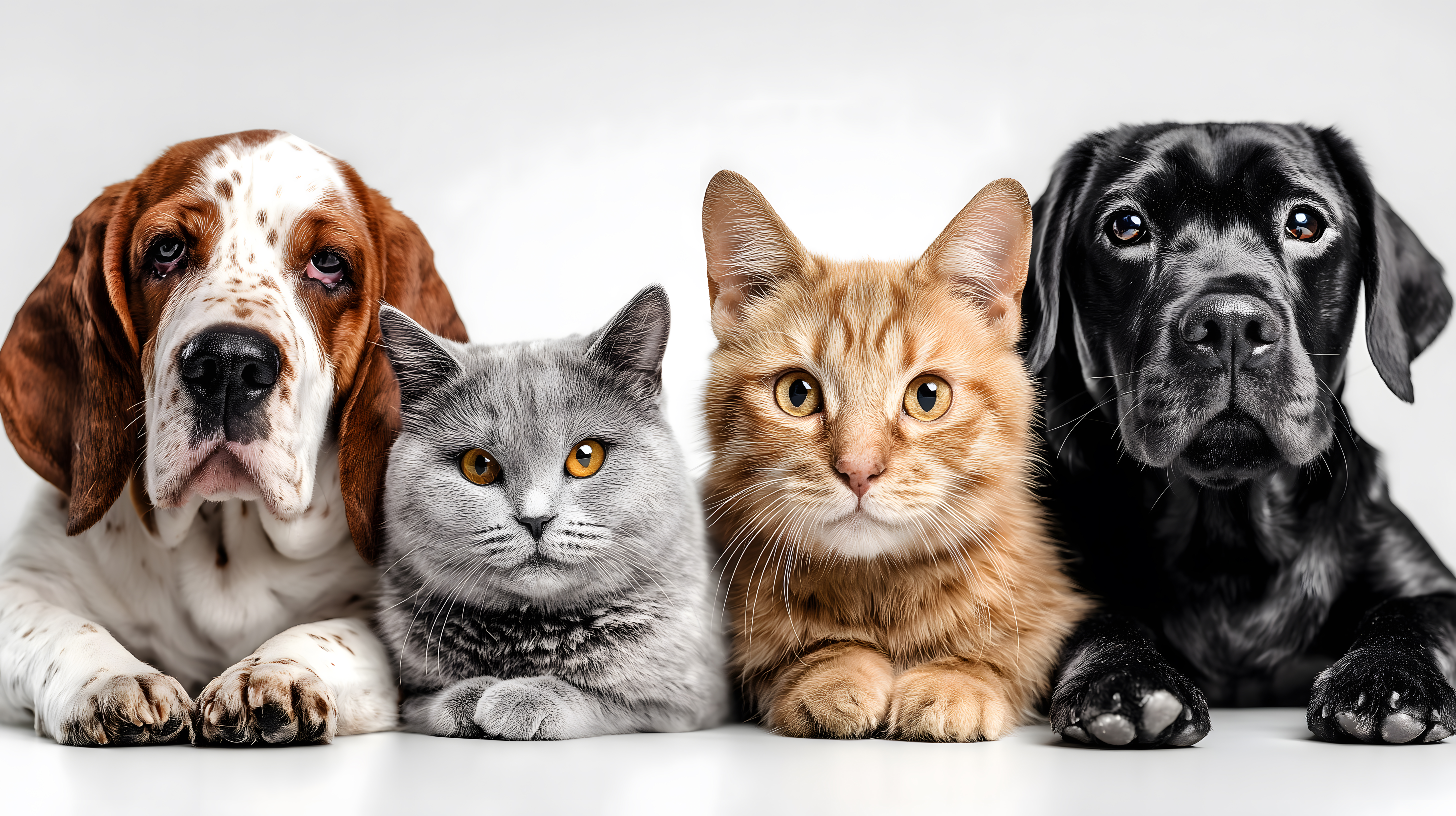 Dieses Foto zeigt eine Gruppe von Haustieren - einen Hund, eine Katze und einen Welpen - auf einem weißen Hintergrund. Die Tiere schauen direkt in die Kamera, was eine einladende und freundliche Atmosphäre schafft. Das Bild eignet sich hervorragend für den Einsatz in Blogs, Newslettern, Social-Media-Beiträgen oder Werbematerialien, in denen ein süßer, niedlicher Blickfang gewünscht ist. Die hochauflösende Datei ist unter einer Creative-Commons-Lizenz frei nutzbar.