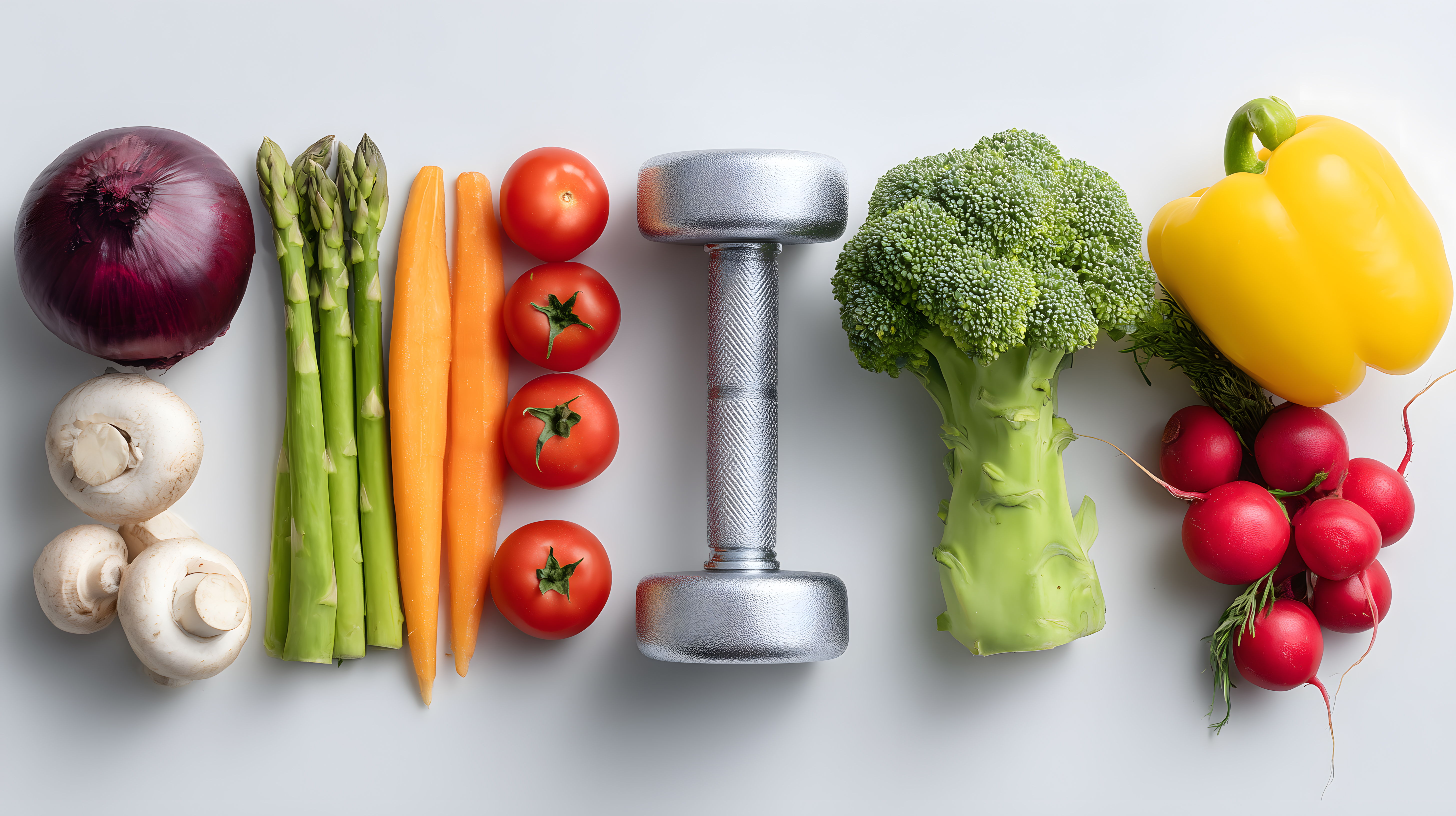 Dieses Stockfoto zeigt eine Auswahl an frischem Gemüse, darunter Brokkoli, Karotten, Tomaten, Zwiebeln und Radieschen, zusammen mit einer Hantel vor einem hellen Hintergrund. Die Anordnung der Objekte hat einen minimalistischen, aufgeräumten Stil, der die Frische und Natürlichkeit des Gemüses betont. Das Bild ist perfekt für Beiträge zu gesunder Ernährung, Fitness und Lifestyle-Themen, wie Blogbeiträge, Newsletter oder Social-Media-Posts. Es ist in hoher Auflösung verfügbar und unter einer Creative-Commons-Lizenz frei nutzbar.