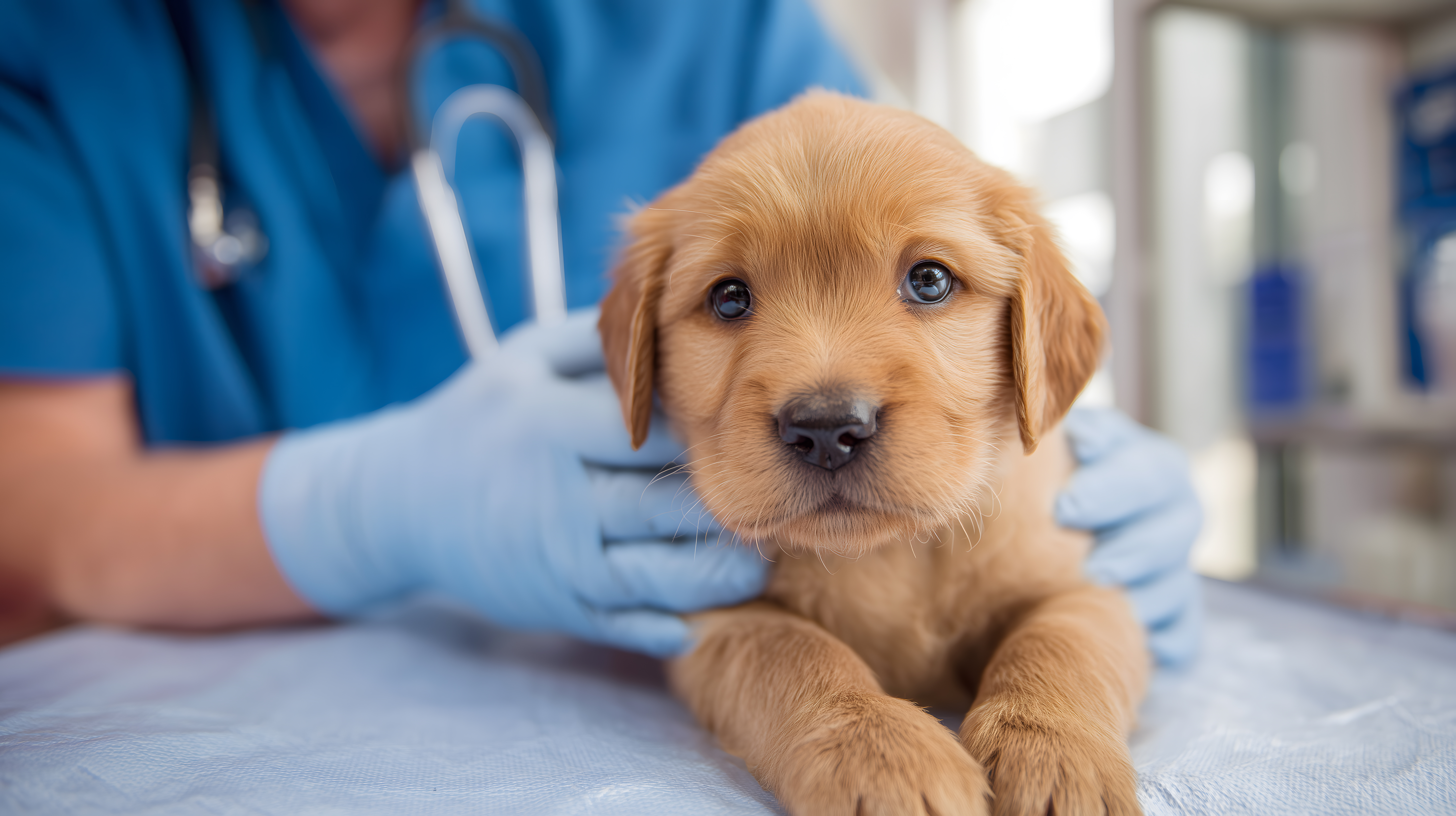 Das Foto zeigt einen Tierarzt, der einen niedlichen, goldbraunen Welpen in einer modernen Tierklinik untersucht. Der Arzt trägt einen blauen Arztkittel und Untersuchungshandschuhe und hält das Stethoskop an den Körper des Welpen, um seinen Gesundheitszustand zu überprüfen. Das Bild vermittelt einen professionellen und kompetenten Eindruck der tiermedizinischen Versorgung. Dieses hochauflösende, kostenlose Stockfoto eignet sich hervorragend für die Verwendung in Blogbeiträgen, Newslettern, Webseiten oder Werbematerialien rund um das Thema Tierheilkunde, Haustiere und gesunde Hunde.