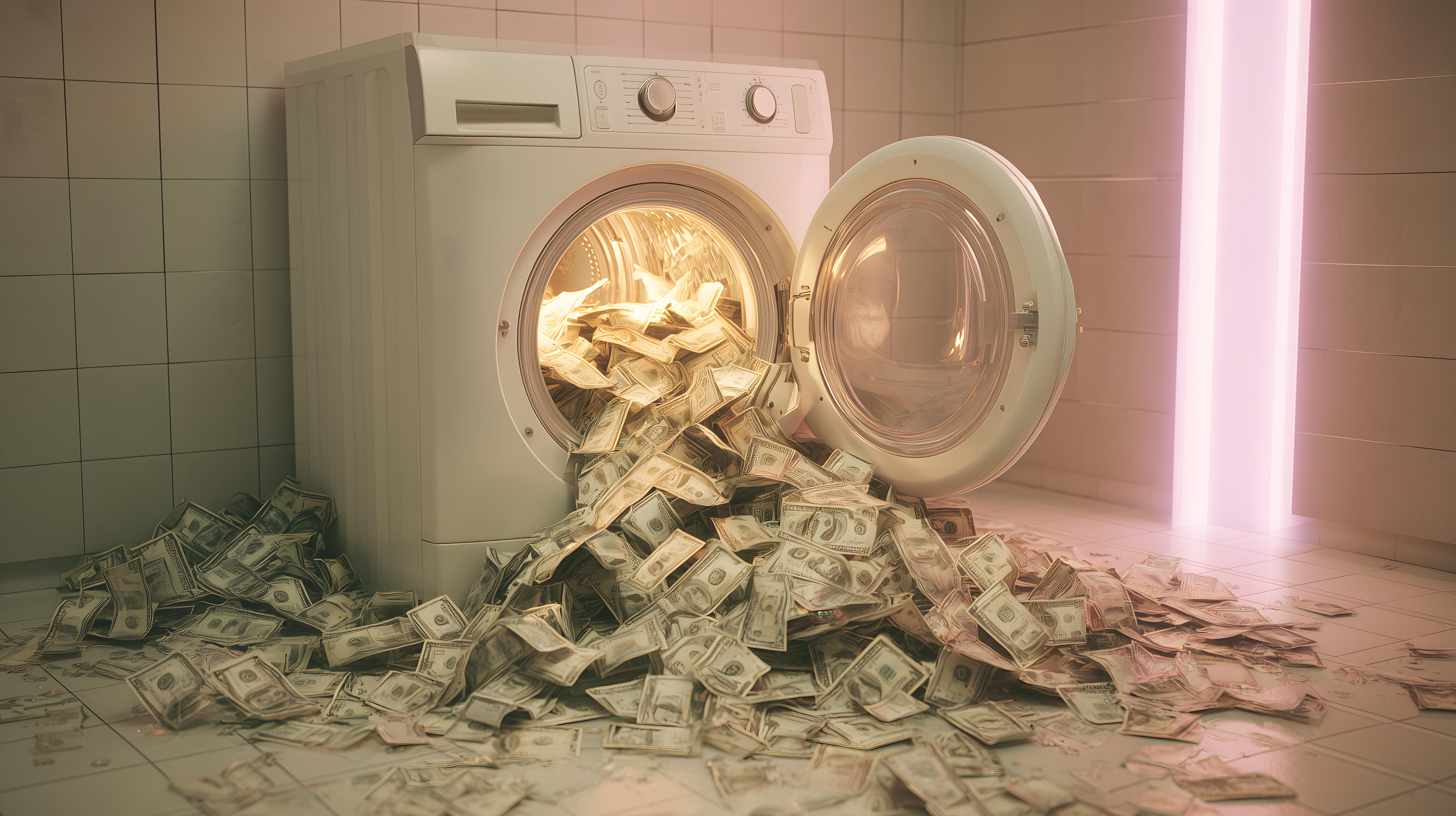 Dieses Bild zeigt eine Waschmaschine, aus der eine Menge Dollarscheine herausströmt. Es ist ein starkes symbolisches Bild für das Thema Geldwäsche und die kriminelle Verwendung von Bargeld. Die Waschmaschine steht auf einem gefliesten Badezimmerboden, was einen Kontrast zum Bargeld-Chaos erzeugt. Die Farbgebung ist eher dunkel und düster, was die ernste Thematik unterstreicht.